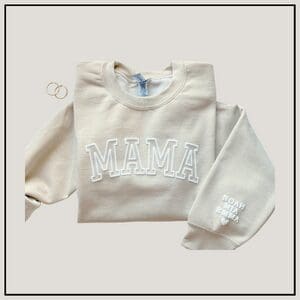 Another personalized gift is perfect for the mothers and auties in your life. Personalize the left sleeve with the kiddos or loved ones’ names. Dang cute.
