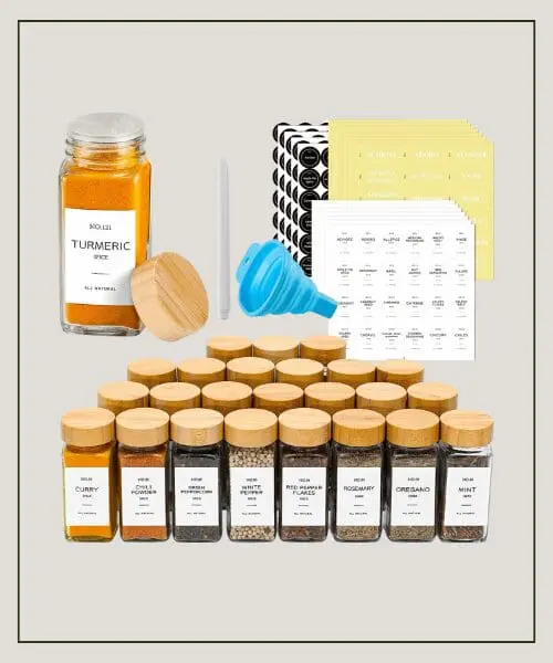 These glass bamboo lid spice containers keep everything organized and looking clean and fresh. They come with three different styles of labels, so you can pick whatever style fits you best.