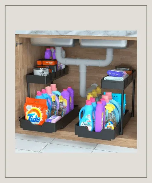Under the sink storage is a must have. These plastic organizers fit perfectly and have pull out drawers so nothing gets left behind, and you can easily rinse them out.