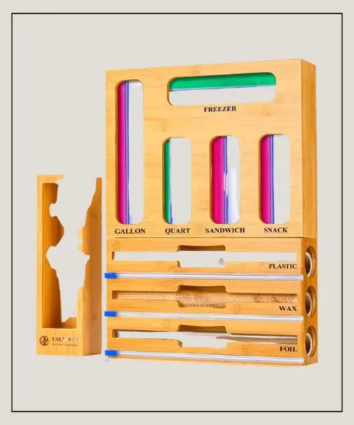 9 in 1 storage bag organizer. The solution is to cut the clutter and have an organized kitchen drawer. Includes a plastic wrap dispenser with a cutter and baggie organizer.