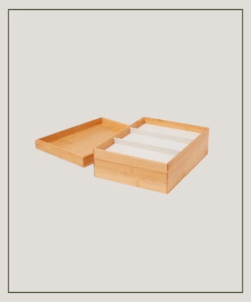 This beautiful bamboo jewelry organizer keeps everything in its place but also looks beautiful on your chest of drawers or nightstand.