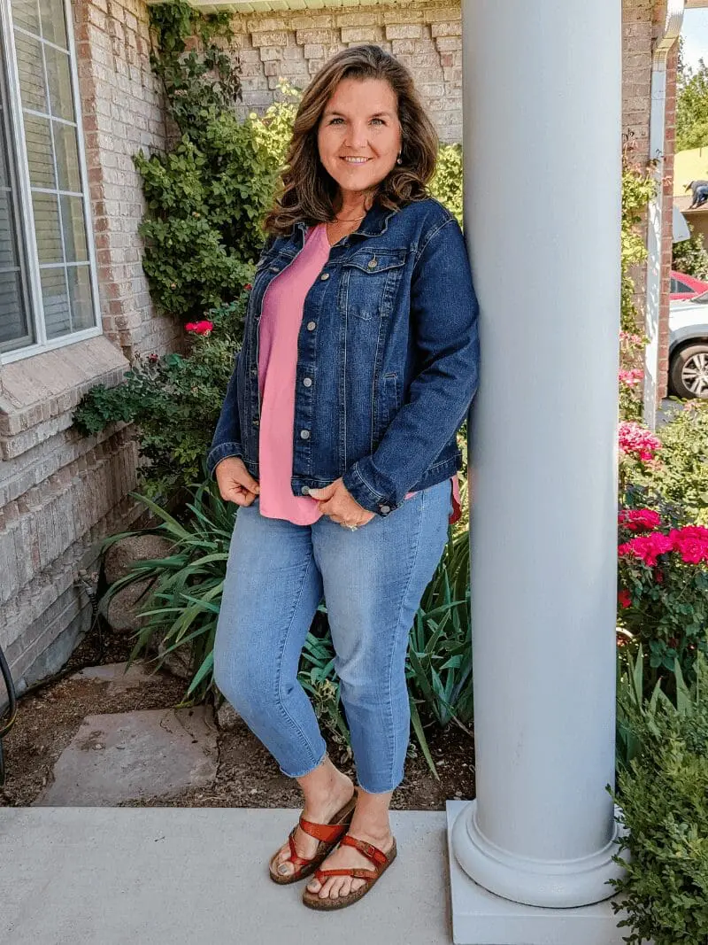Sister #4 Monica – Denim Jacket / V-Neck Shirt / Capri Jeans / Brown Sandals