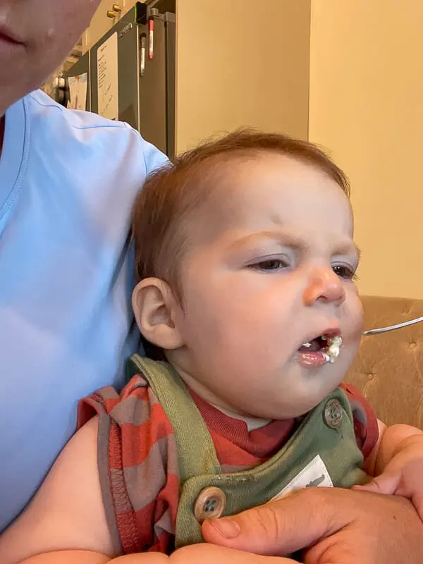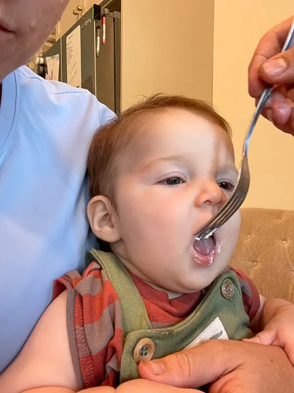 We started Malcom on semi-solid foods last week. His first taste of real food was runny egg yolk from one of our own chicken eggs we fried up. Egg yolk contains all kinds of healthy fats, fat-soluble vitamins, and is a great source of lots of brain nutrients like choline and omega-3 fatty acids. He seemed to like it, but he’s got a bit still before we start supplementing his food for real. Bananas and avocados are next.