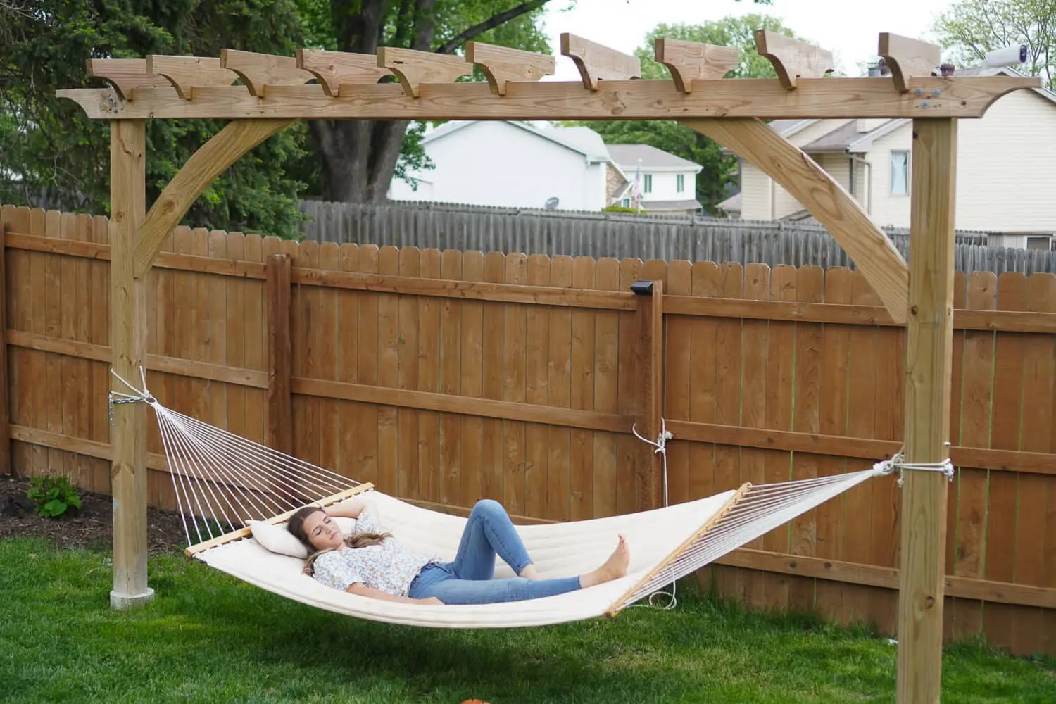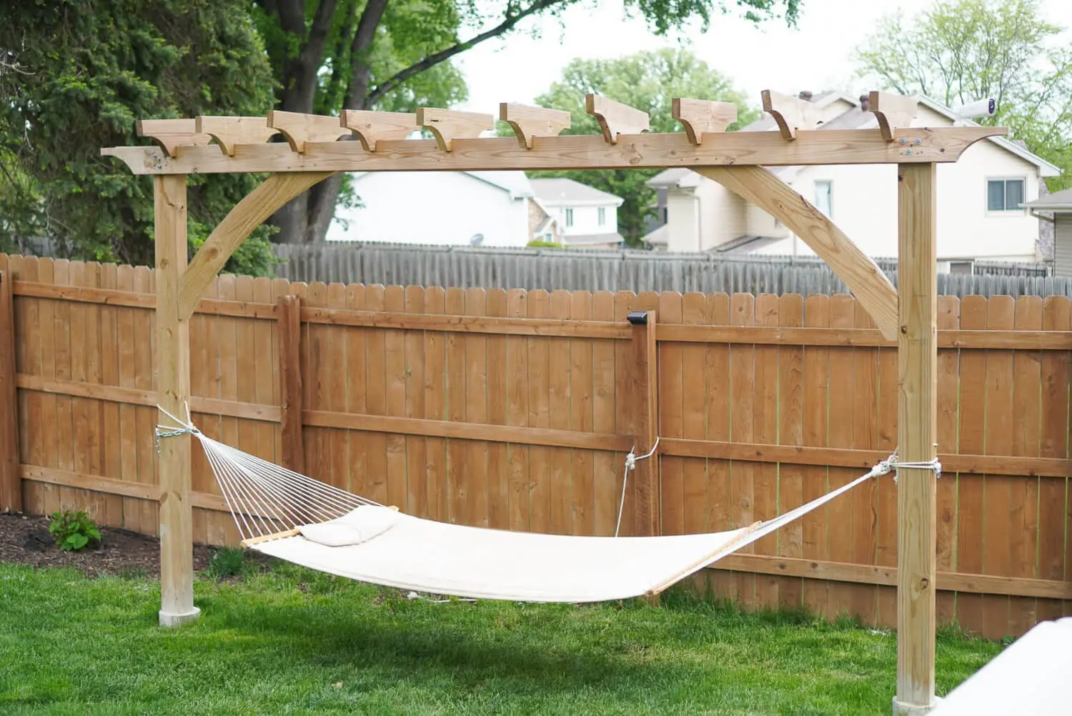 And that’s it. The backyard hammock stand is ready for all kinds of swinging. My girls love playing on it, and I love how beautiful it looks in our yard.