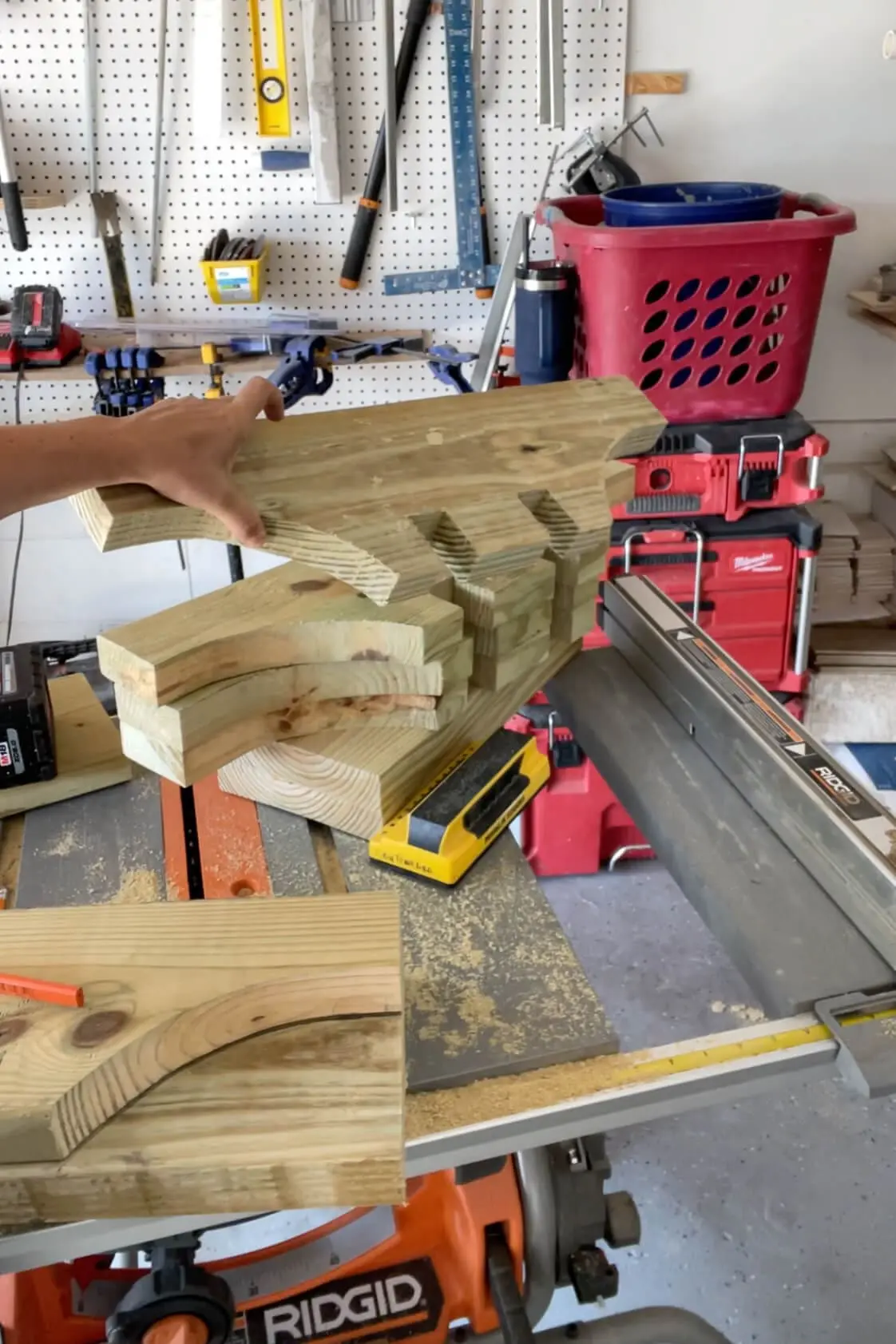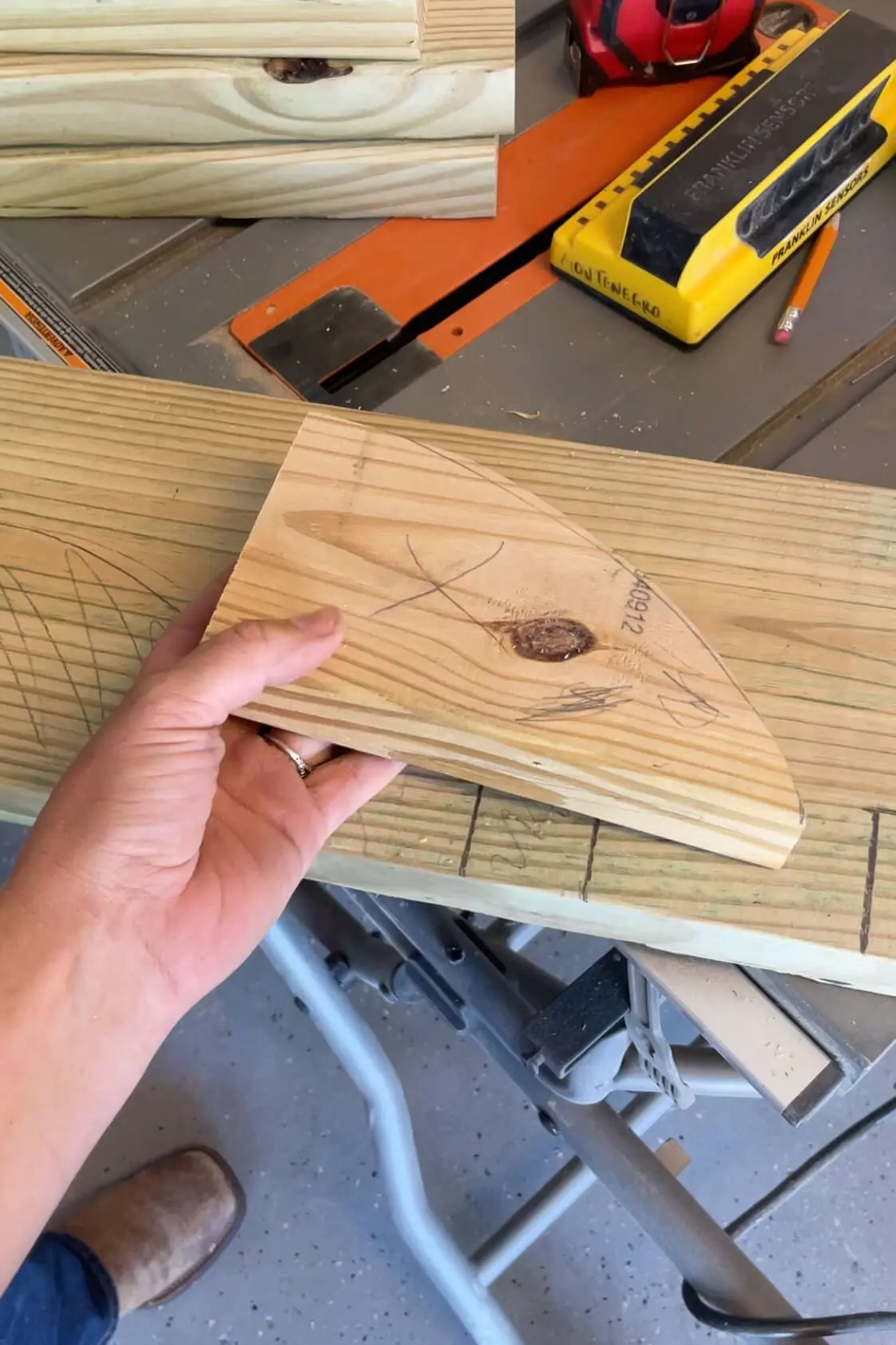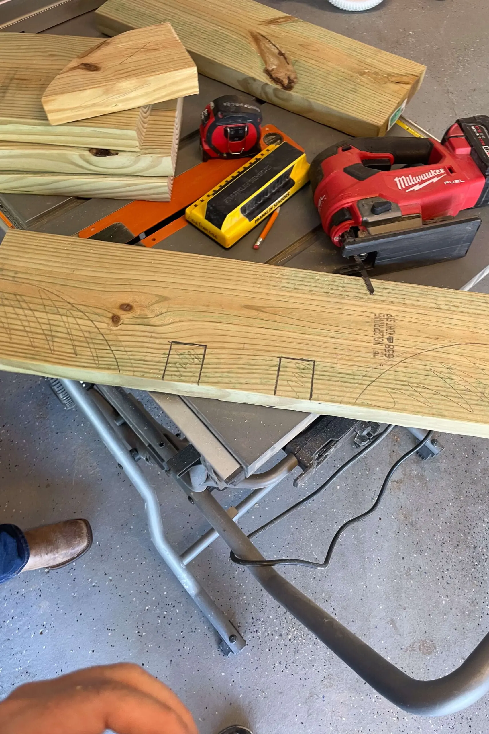 Now that they were cut to length, I needed to cut out the design. I took the rounded cutout piece leftover from what I had already cut out of the ends of the cross beams and cut 1/2 inch off of the end to make it just a little bit shorter. I traced the rounded detail onto each end of my cross brace, then marked and drew the notches that needed to be cut out for each of the cross beams.