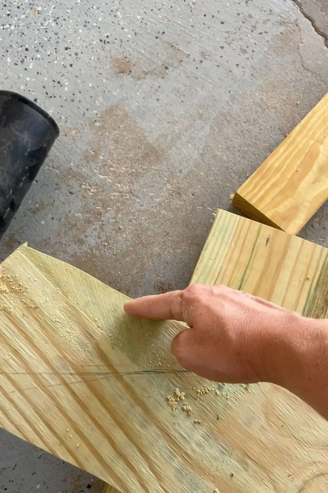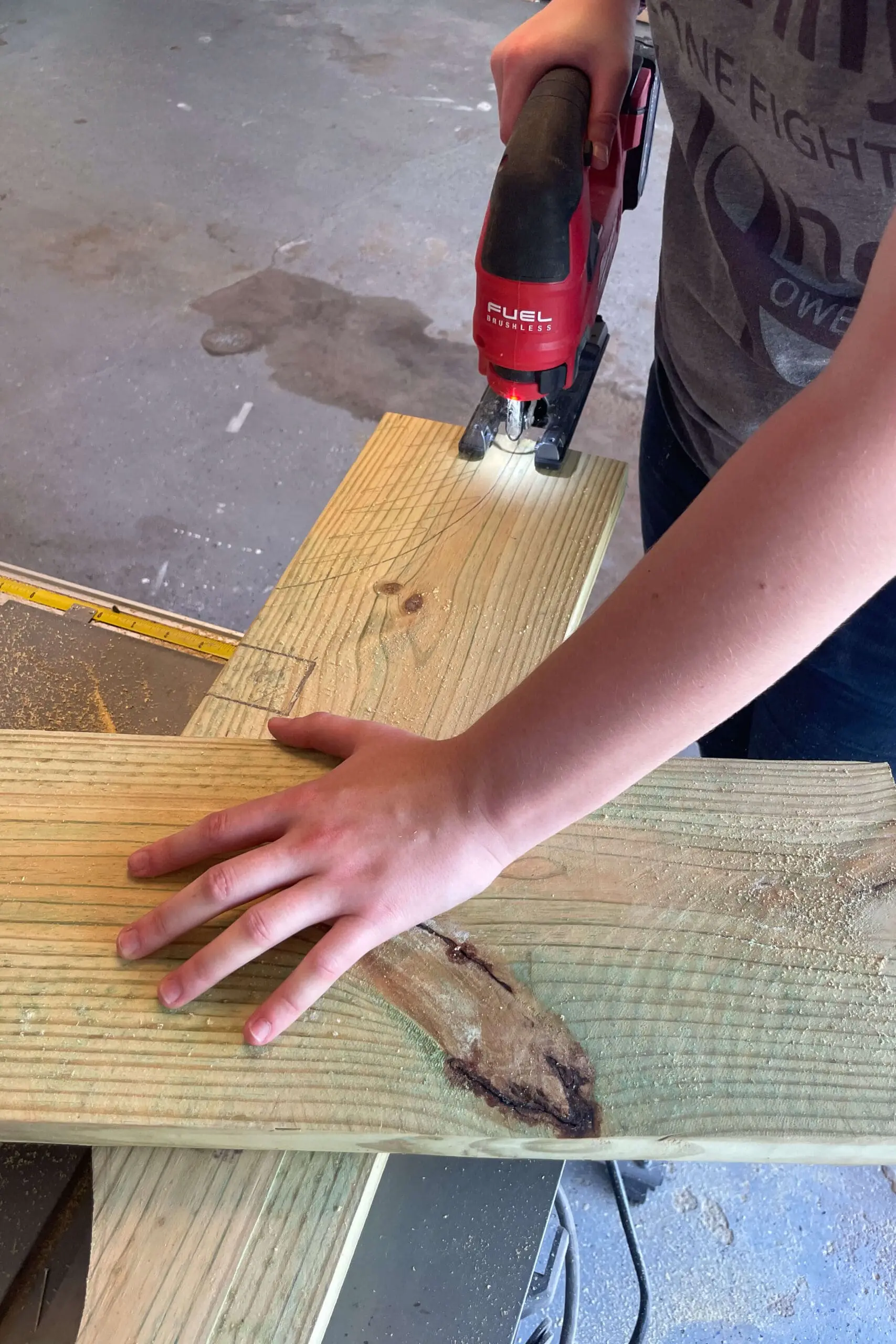 Once we had our cut lines marked, my battery operated circular saw was the perfect tool for cutting the wood right in the backyard. Just lay the 2×6 across another piece of wood to elevate it off the ground for cutting.