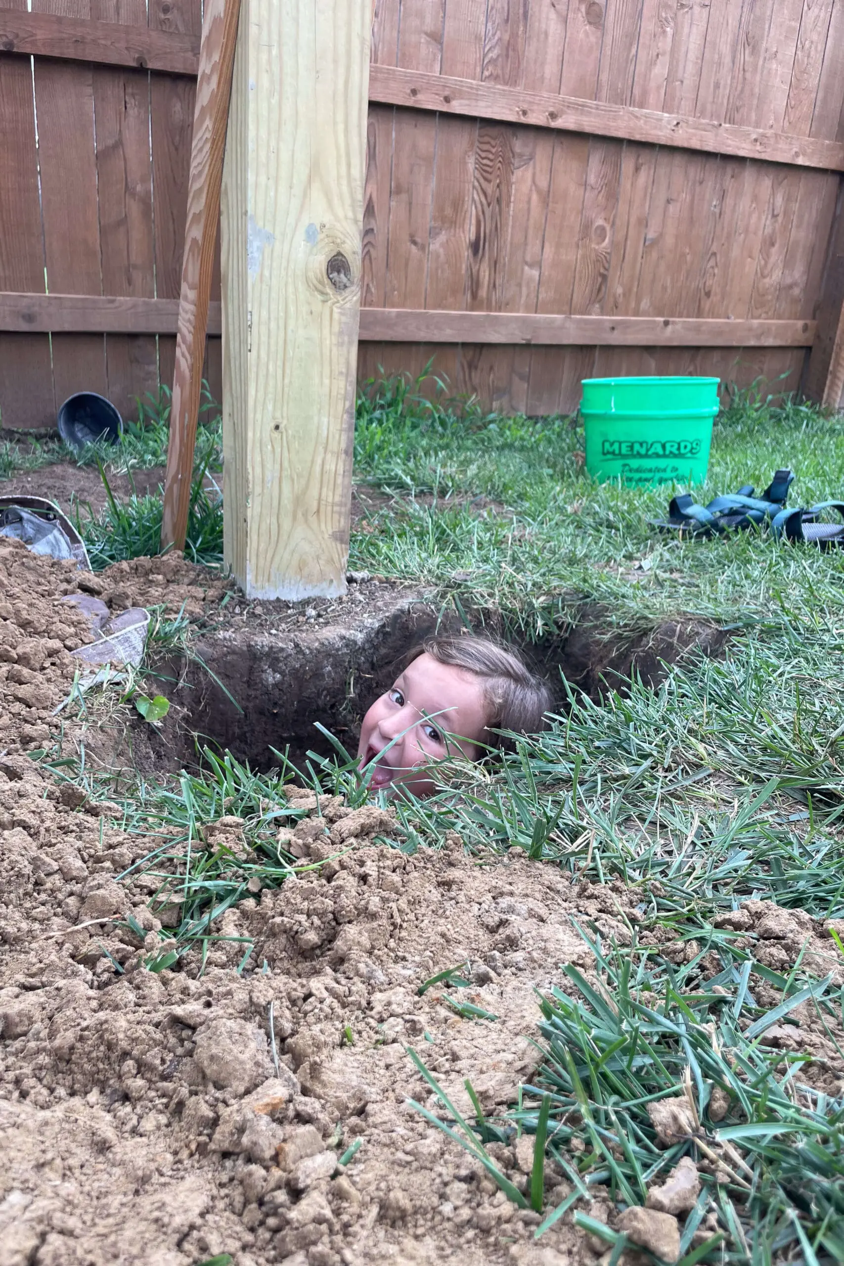 Since that first mistake, I have learned that as a basic rule of thumb, you want about 30% of your post to be in the ground. So for 12 foot long posts I will have 4 feet in the ground and 8 feet above the ground. That’s a lot of digging, but it can be done. My daughter was just about 4 feet tall at the time, and worked out as the perfect measuring stick for our 4 feet deep hole.