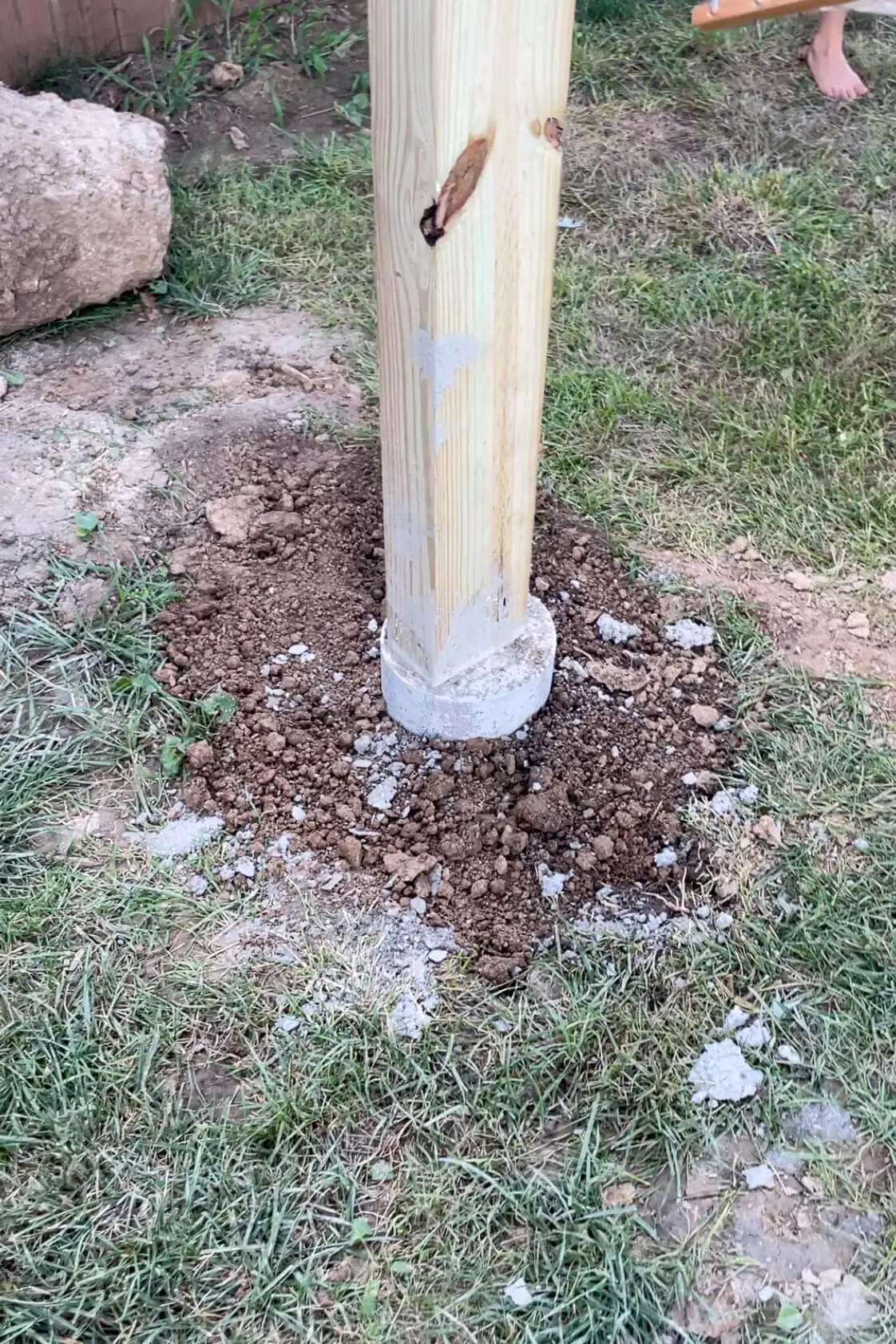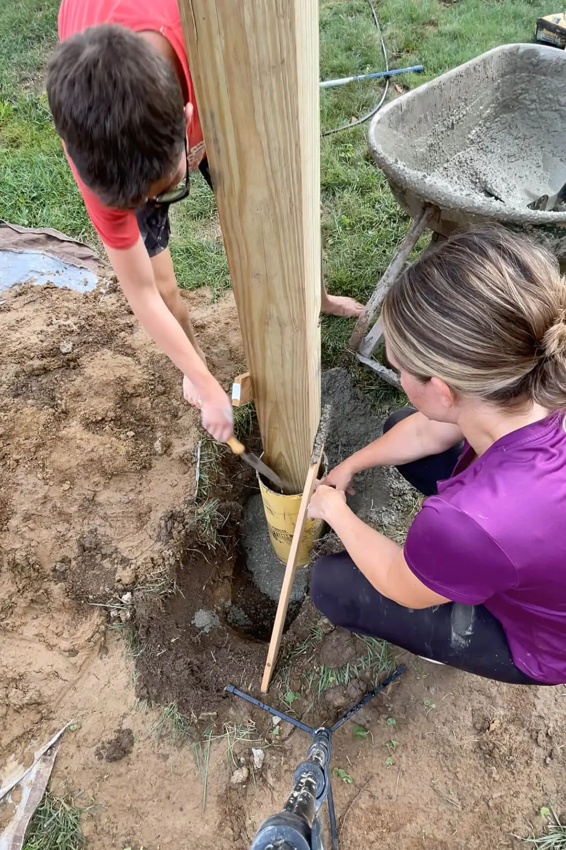 We used a garden trowel to make sure that the inside of the cardboard tube was also getting nice and full of concrete around the post. The hole doesn’t need to be full to the top of the concrete. The remainder of the hole we will backfill with dirt after the concrete is dry.