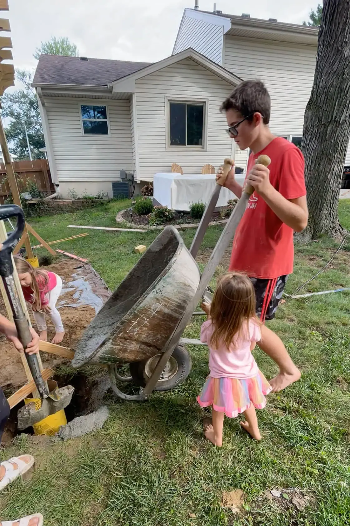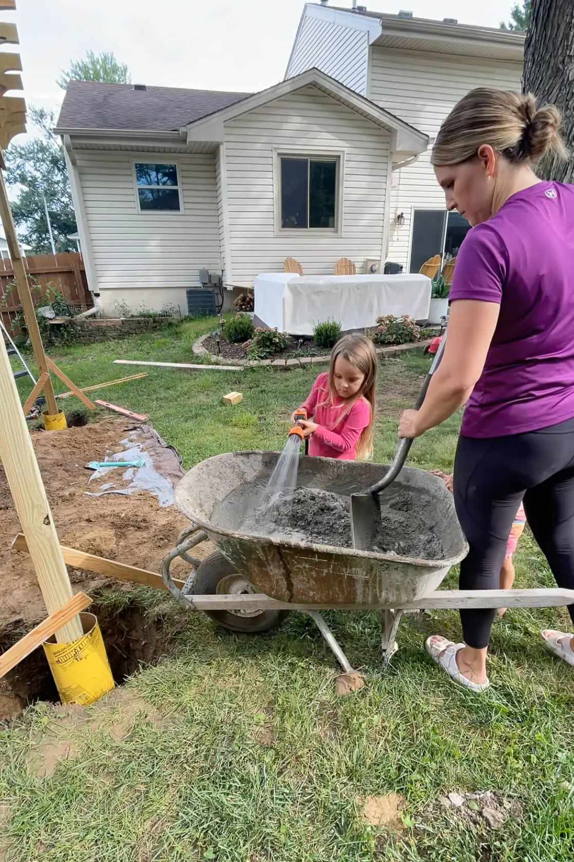 A wheelbarrow, shovel, and a little water are all you need for mixing and pouring your concrete.