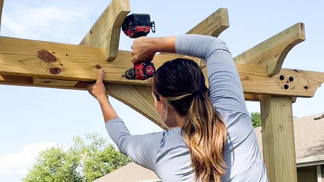 For the top side of my arch, I’m attaching it straight to the backside of the cross beam with screws. For the lower edge of the arch, I’m lining it up flush with the front of the side post, then using a few pocket holes, I screwed it right to the post.