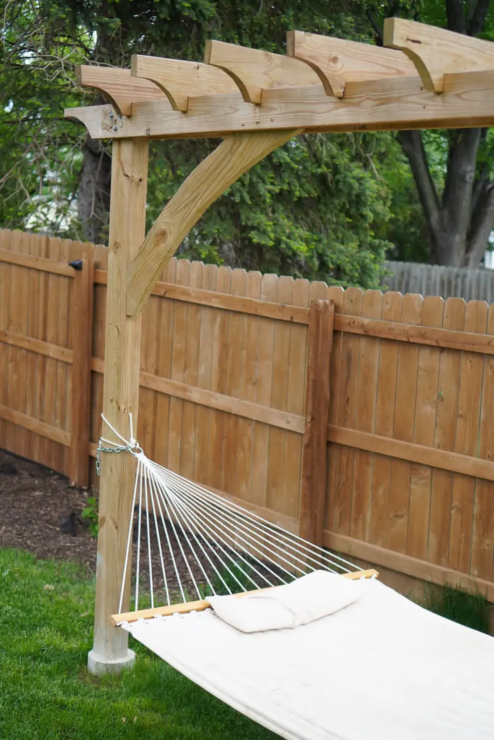 Now that the building of my backyard hammock stand is done, it is time for all the finishing details. The cardboard tubing surrounding the post can be torn off, and the holes backfilled with dirt. Eventually I would love to plant something pretty to climb the edge of my backyard hammock stand. If you have ideas of what I should plant, be sure to let me know in the comments.