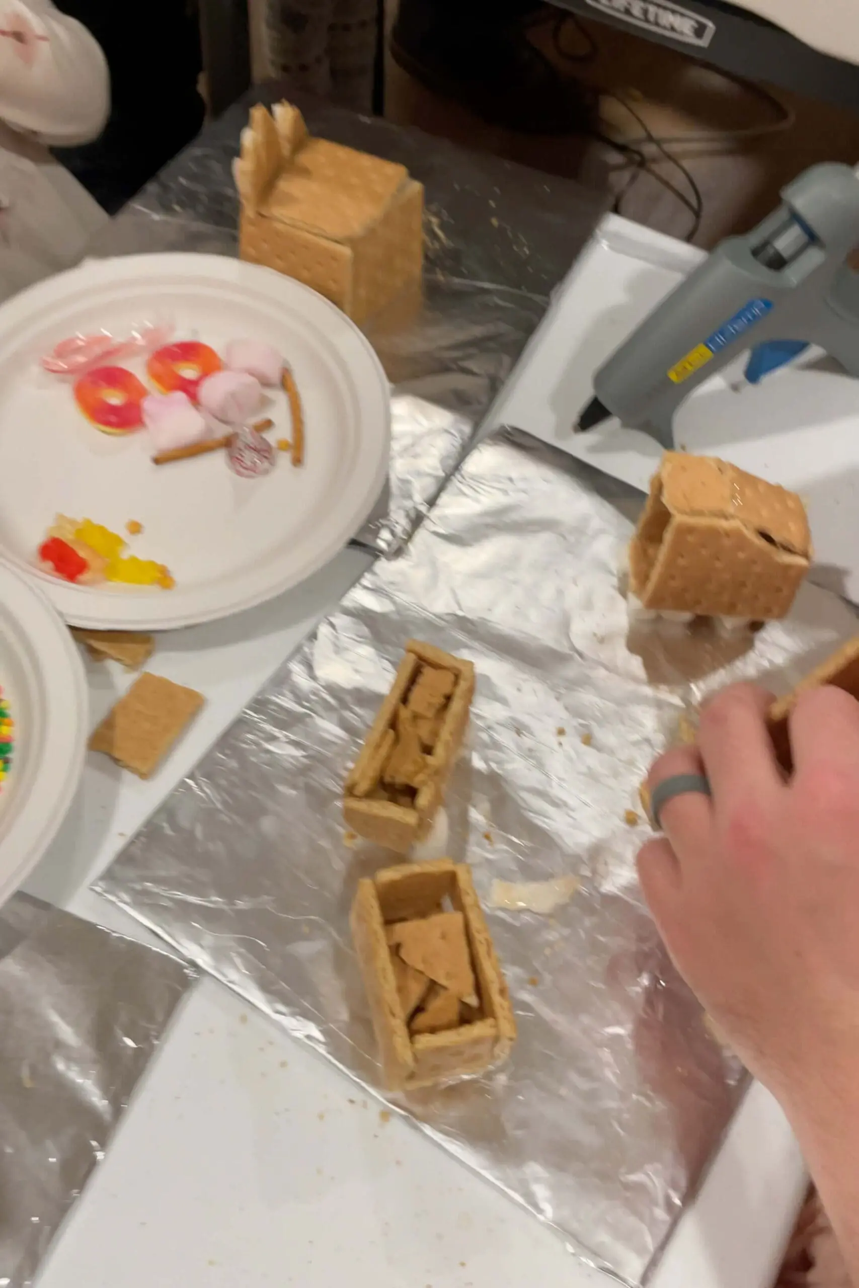 Using hot glue instead of icing for assembly makes building faster and more stable, though it’s only suitable if the houses won’t be eaten.