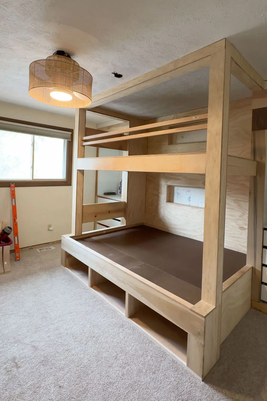 Isn’t it amazing what a difference wrapping with plywood makes? These DIY bunk beds are coming along.