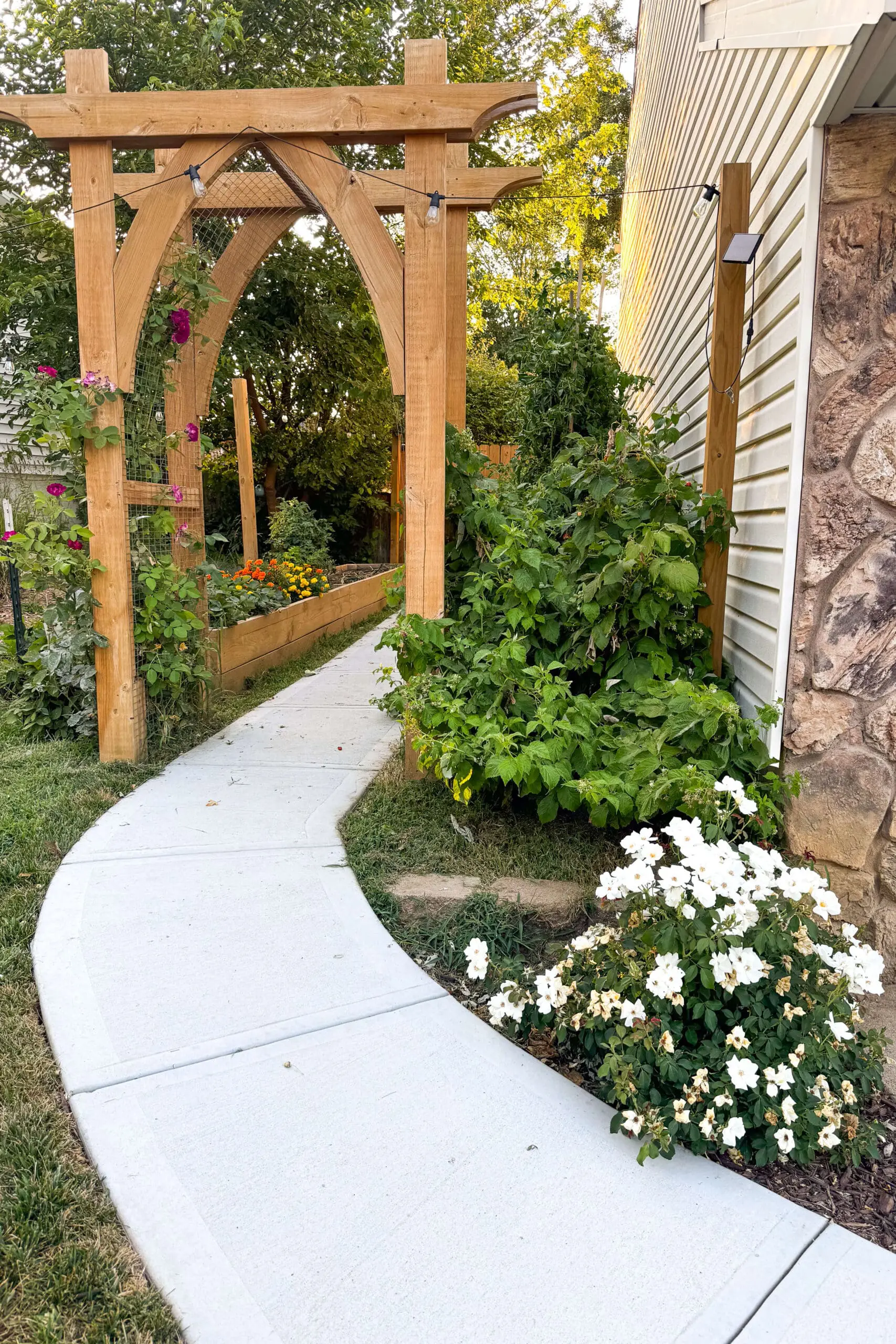 White Knockout Roses add a special touch to the small bed by our veggie garden, proving even vegetable gardens can be beautiful. Remember, yard designs can enhance any part of your property, including underused side yards, optimizing space for your family’s needs.