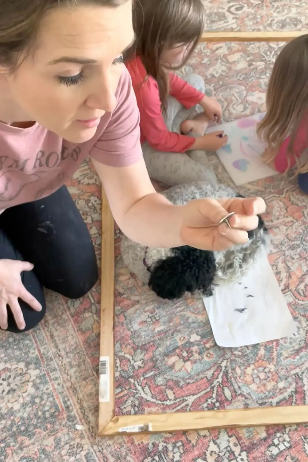 To assemble the frame I laid out all four pieces of the DIY bathroom mirror frame onto my living room floor. I applied wood glue to the edge of the wood where my two pieces of trim would meet, smearing the glue just a bit with my finger before pressing the two corners together. Then, using my brad nailer, I nailed the trim pieces together, adding 1 1/4″ bad nails on both edges of the frame.