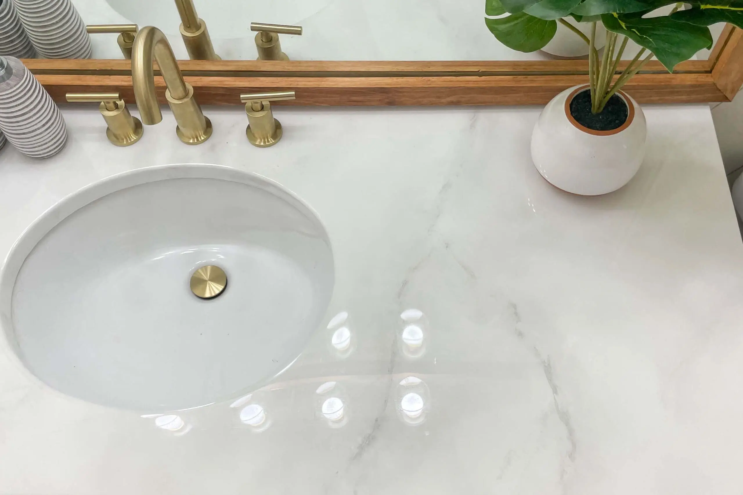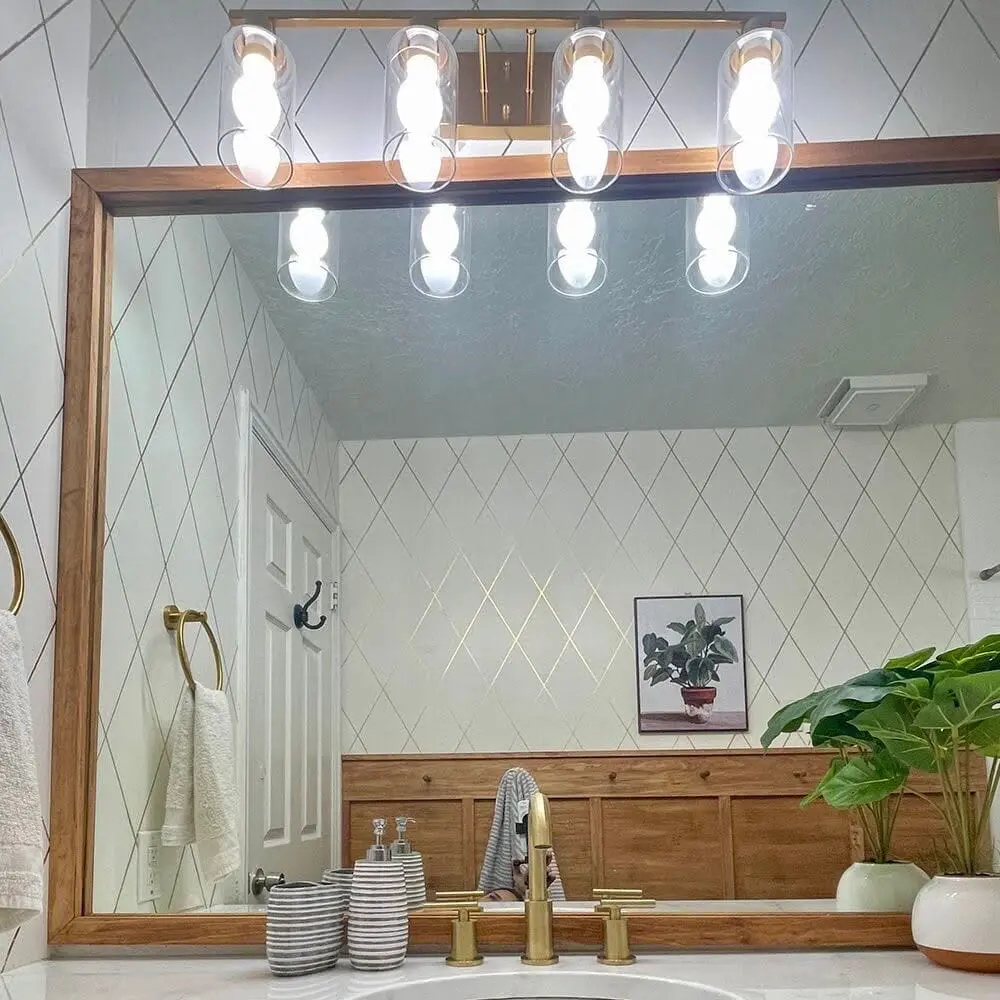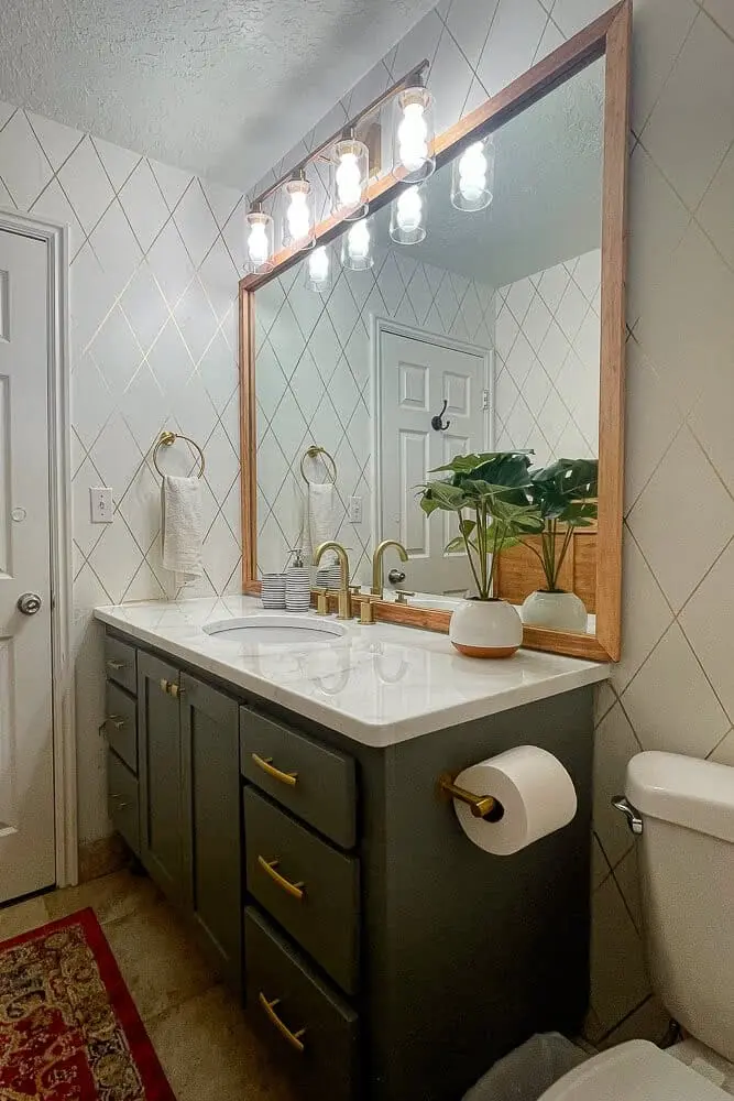 Throughout this small budget bathroom makeover, I painted the shower tiles, made a faux marble counter over the existing granite countertop, used a gold sharpie to mimic wallpaper, and added a wood feature wall. But the quickest and easiest project was my DIY bathroom mirror frame.