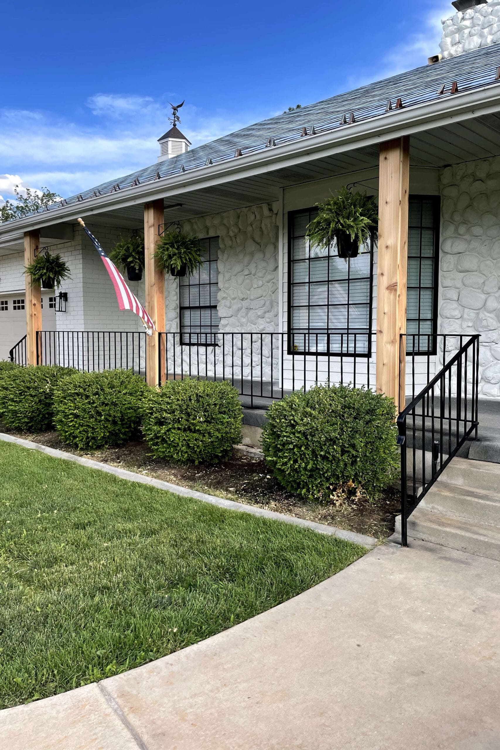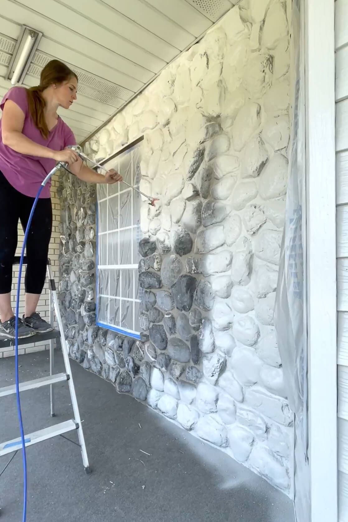 The most controversial part of this porch upgrade was painting the stone. I know painting stone isn’t everyone’s favorite (I’ve heard it all!), but when we lived in our Omaha fixer-upper, I tackled that dated rock facade a little differently. Instead of just painting it, I first grabbed some mortar and filled in the deep crevices to give it a more updated, natural look. If you’re curious about that technique, you can check out the full tutorial right here.