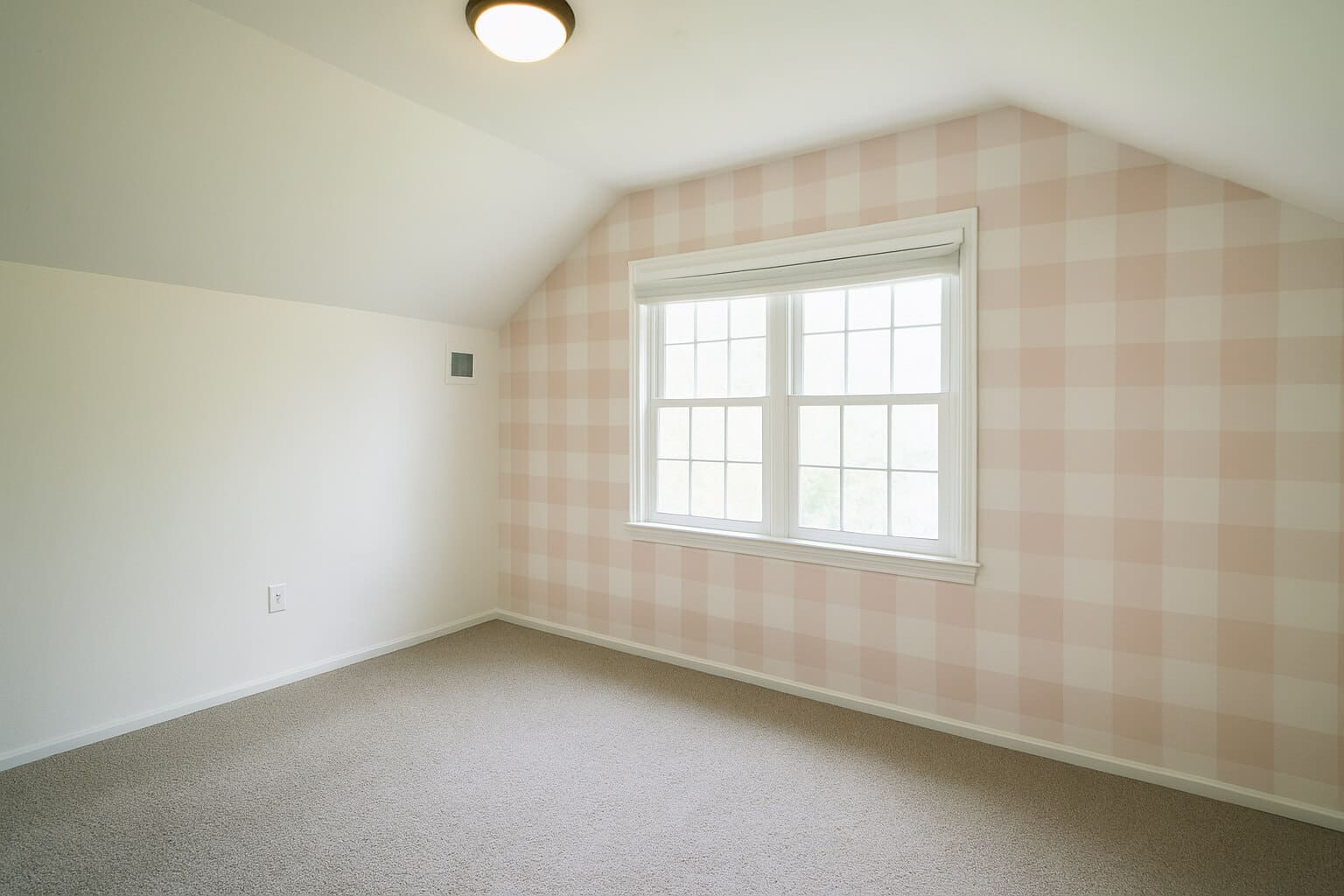 DIY pink buffalo plaid feature wall in a bright girl’s bedroom with vaulted ceilings and soft neutral carpet