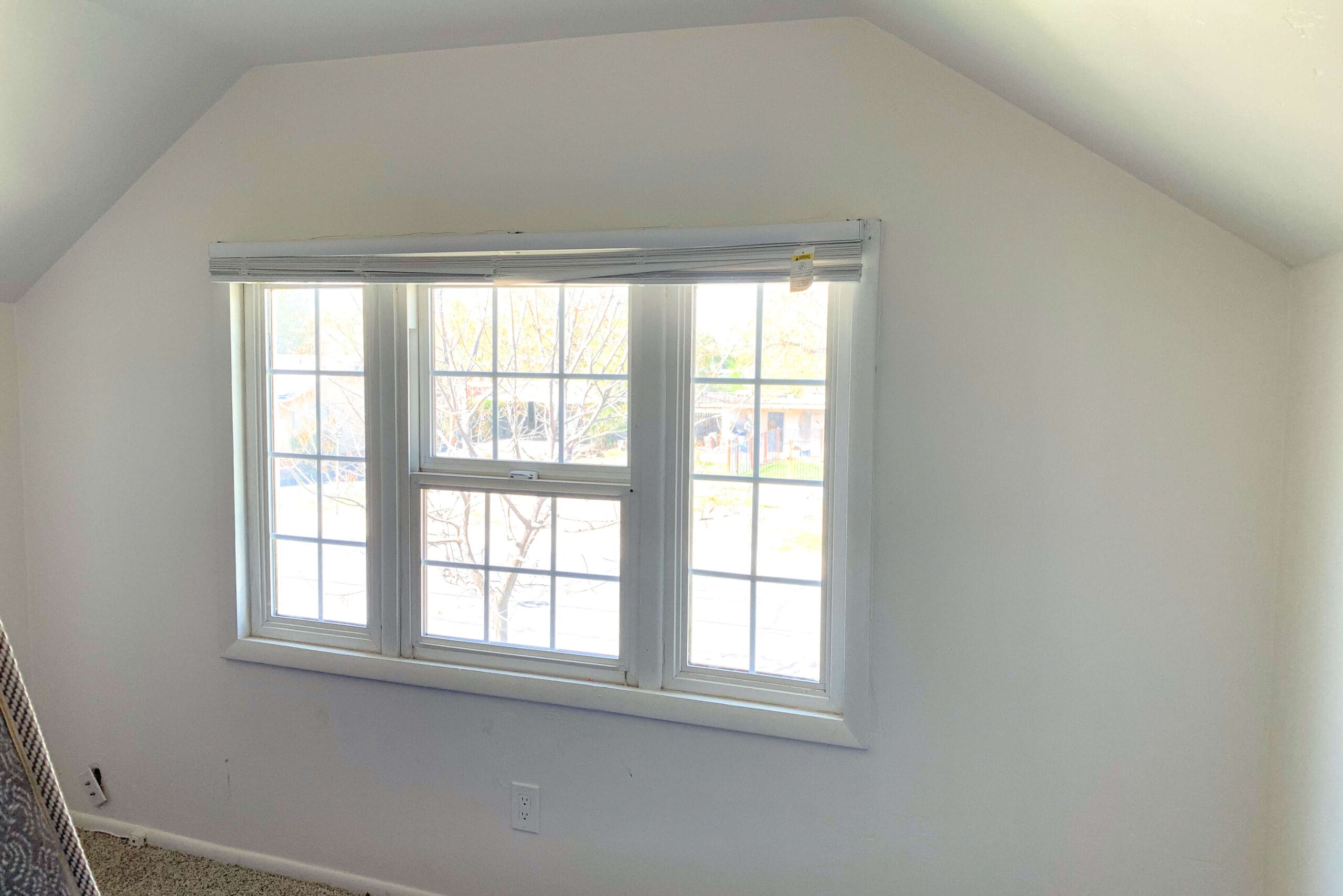 Plain white bedroom wall with windows before painting a DIY accent wall for a girl’s room makeover.