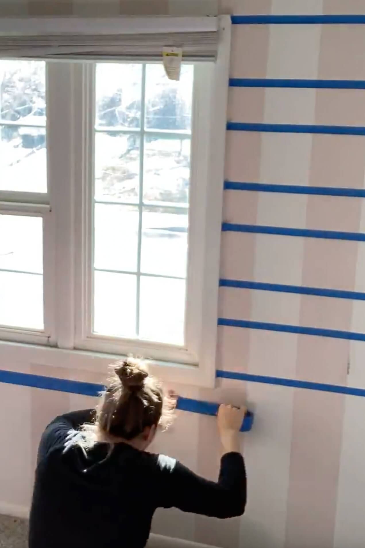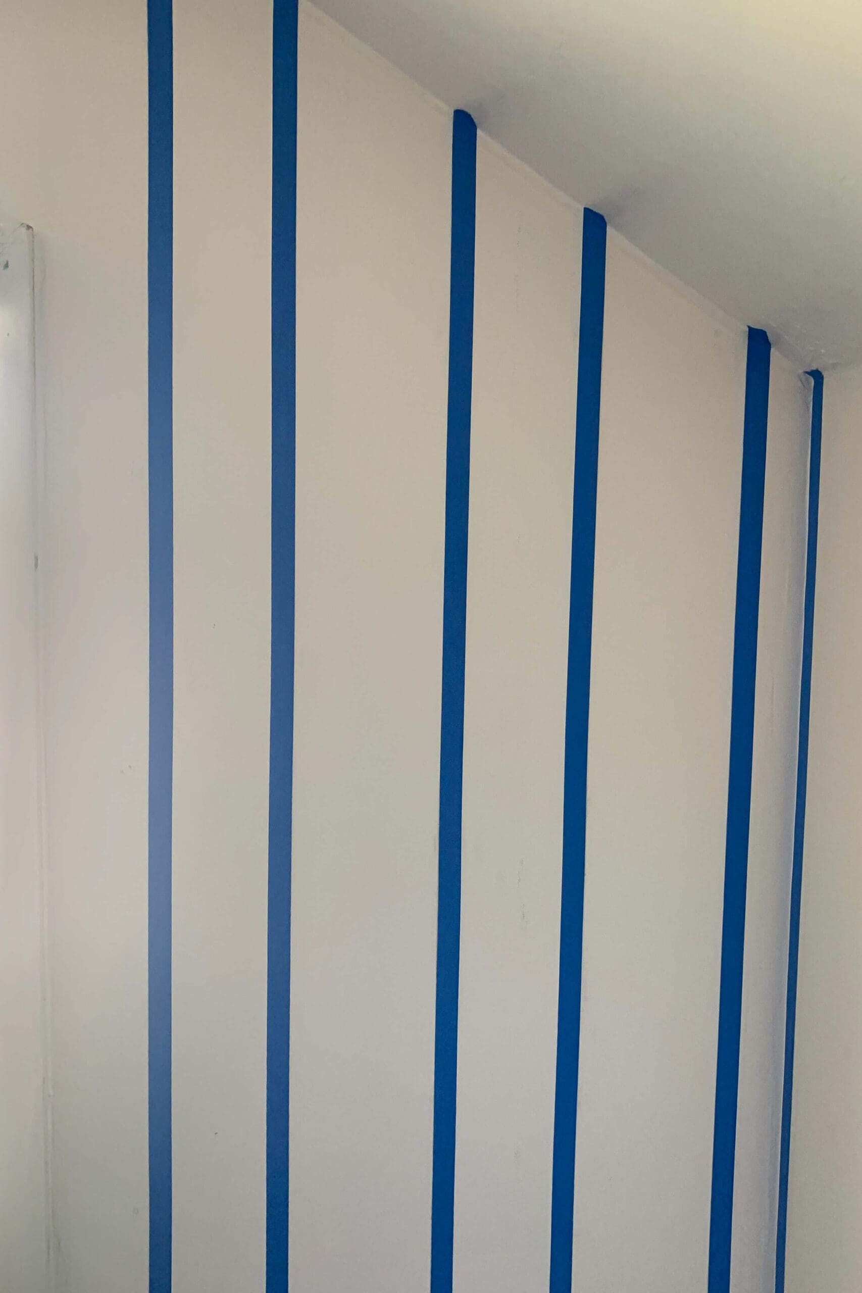 Once the vertical stripes dried completely, I grabbed my level again and marked horizontal lines 6 inches apart. A laser level would’ve made this even easier (highly recommend if you have one!). I taped along the pencil lines, just like I did for the verticals.