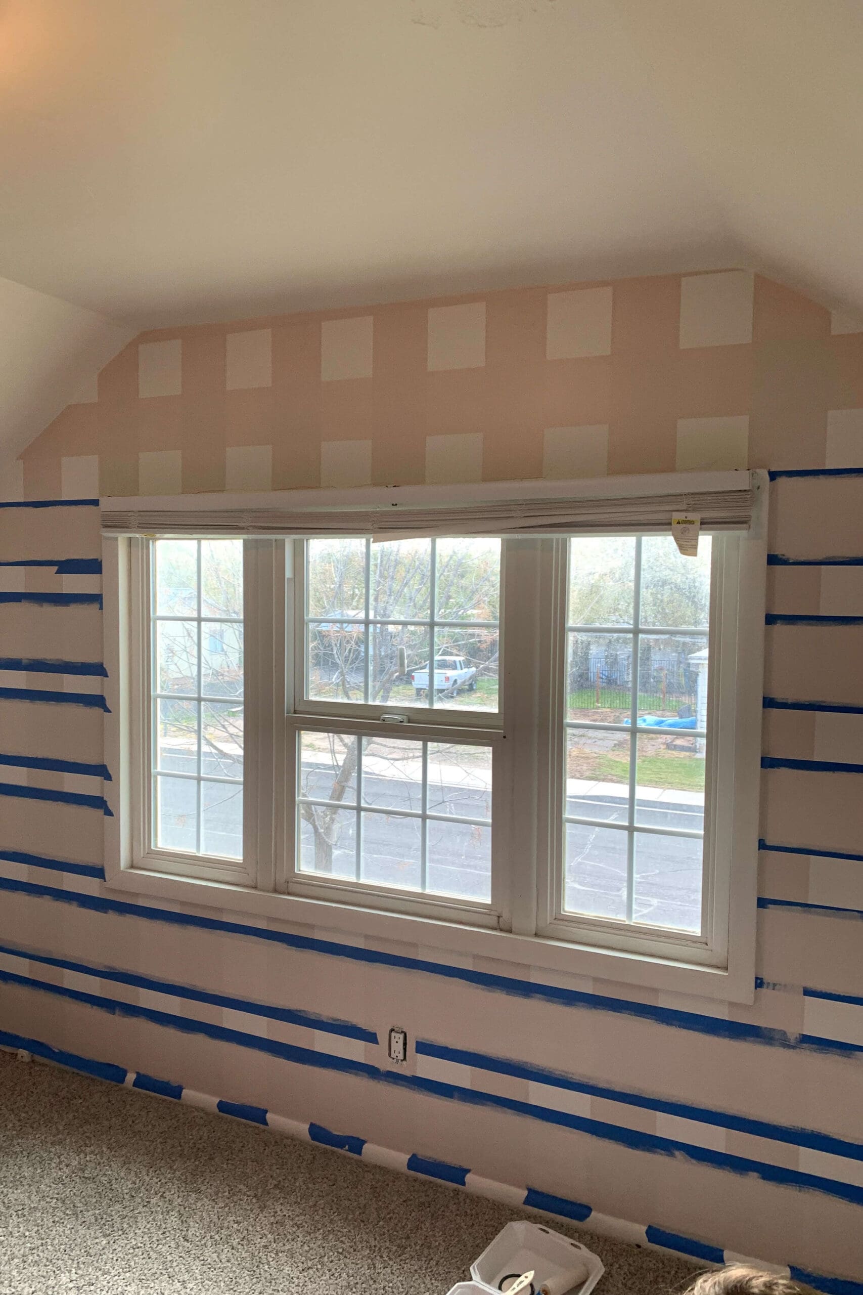 At this point, I could’ve stopped. The soft pink stripes already felt so cute and gave the room such a sweet vibe – but I knew the buffalo check pattern would take it next level.