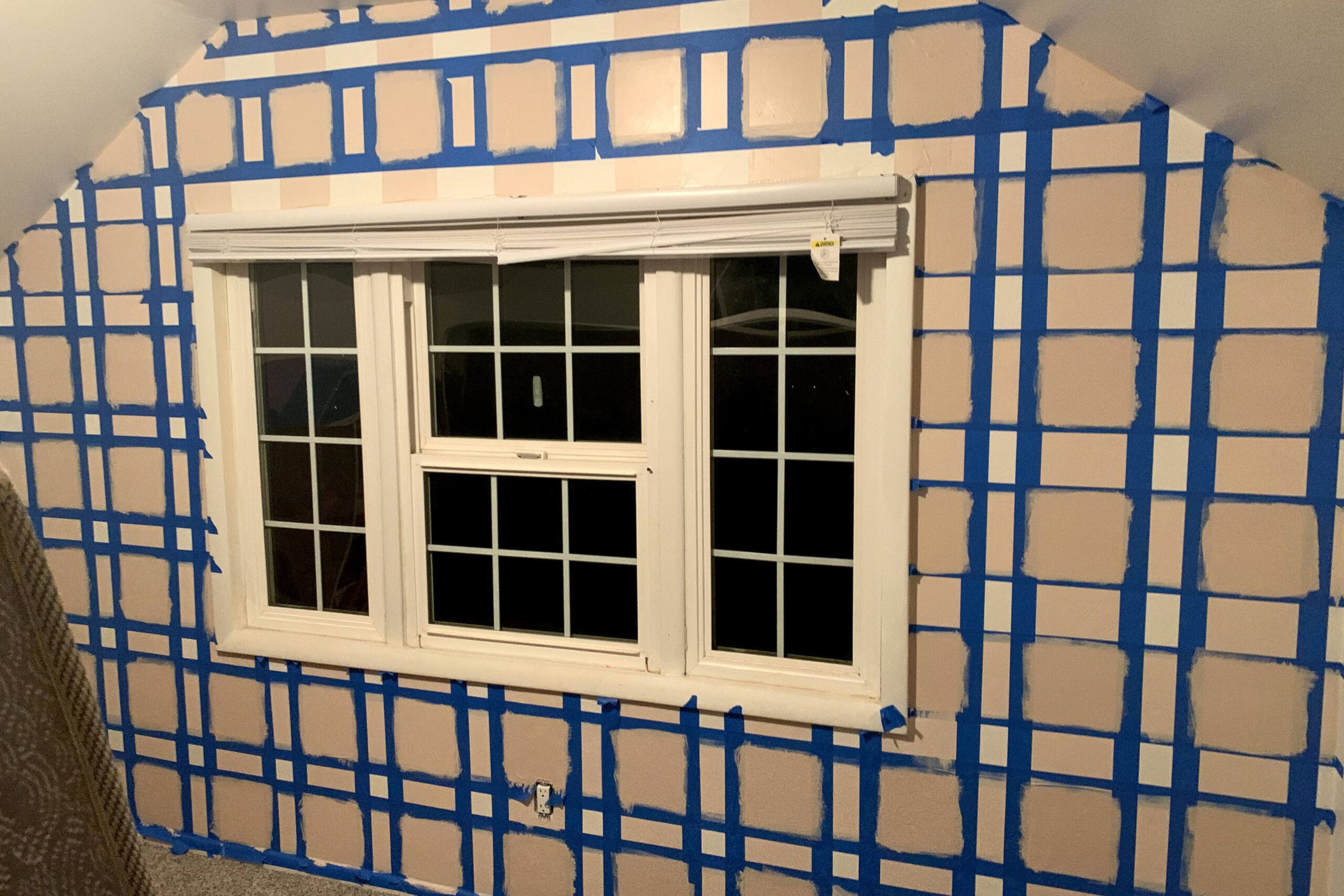 Squares painted across the top section of a bedroom wall, showing the progress of creating a buffalo plaid pattern with painter’s tape in place