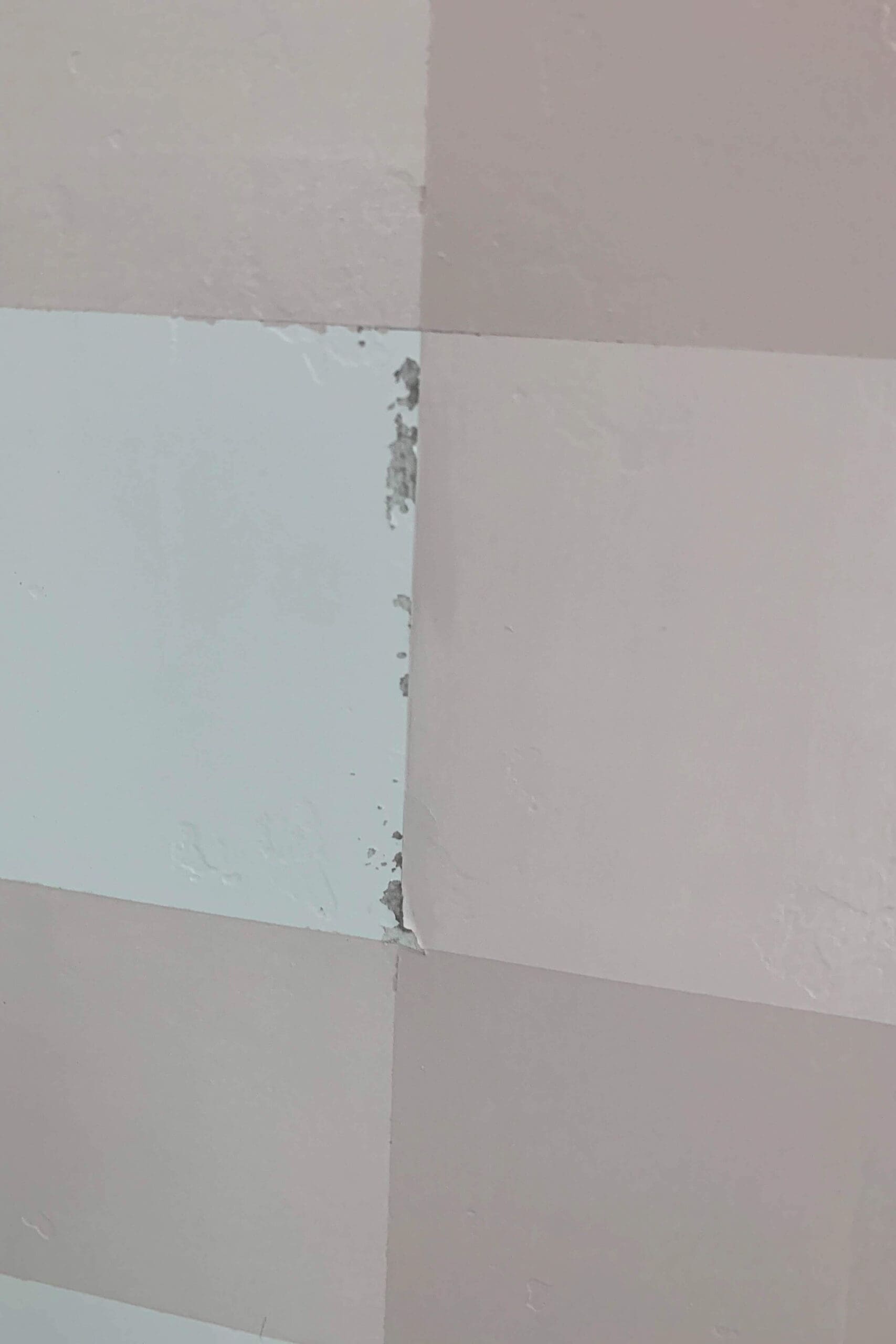 Close-up of a buffalo plaid wall showing minor paint bleed and peeling along the tape lines after removing painter’s tape