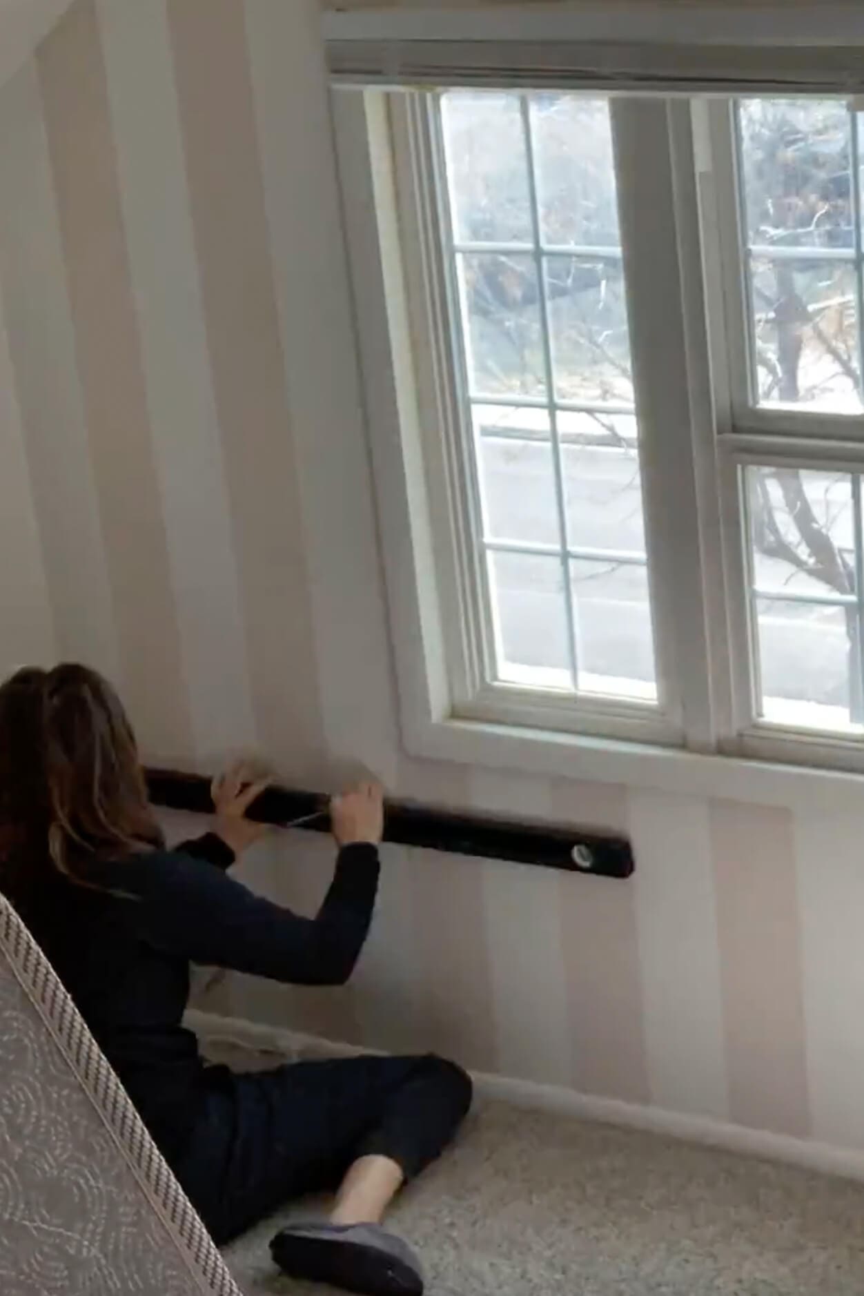 Prepping a blank angled bedroom wall before starting a DIY accent wall painting project