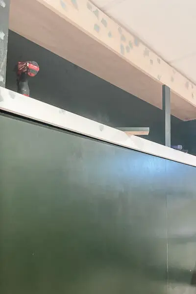 I also added that vertical piece in the middle of the built-in because I needed something to attach the four doors on the top section. It’s the only part where I used pocket holes. Since the piece had to be perfectly centered for the doors to align properly, my laser level was essential in finding the exact middle.