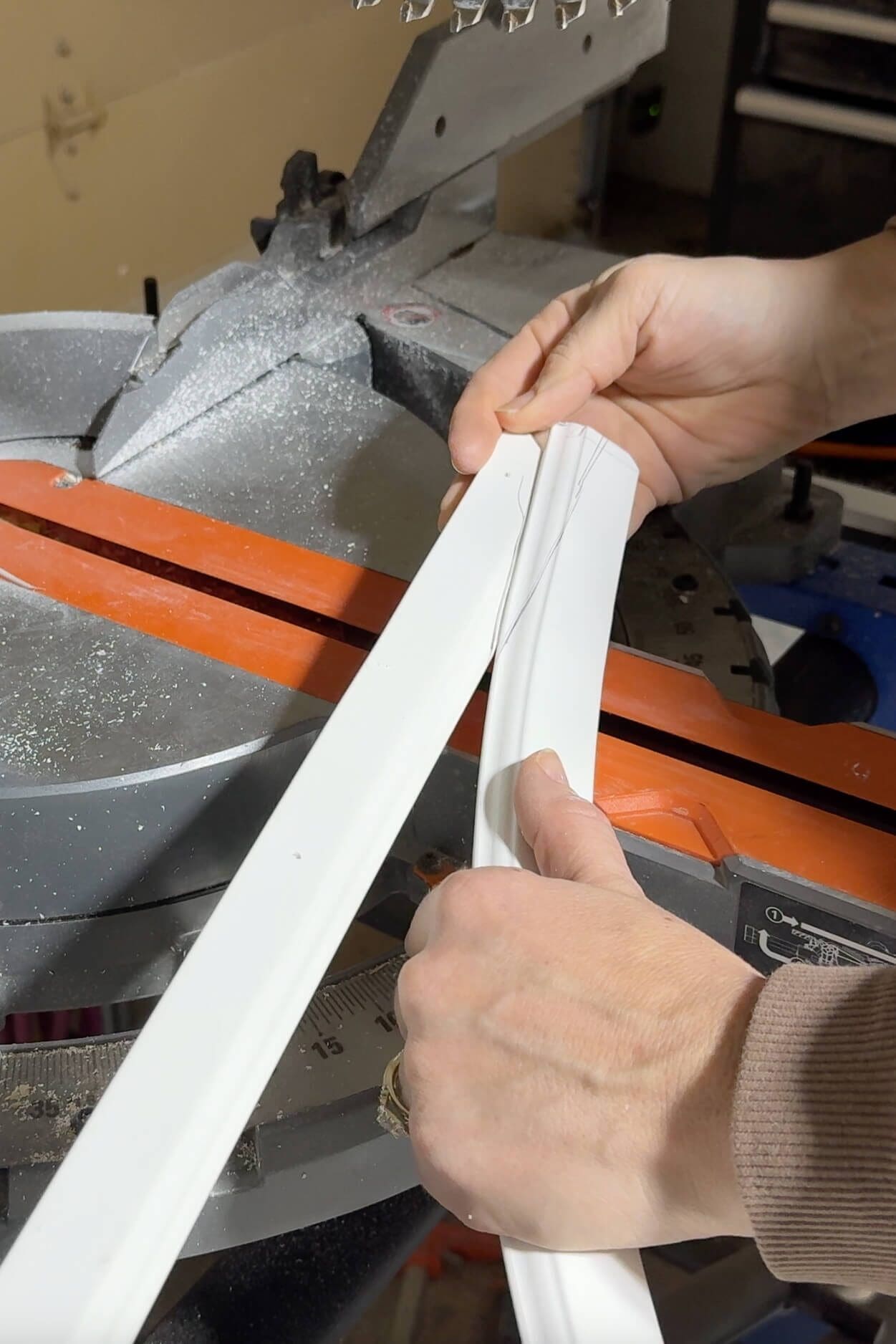 After removing the curved trim from the wall, I used my miter saw to cut the lower corners. By marking where the pieces overlapped and splitting the difference, I achieved a clean, pointed angle that looked seamless.