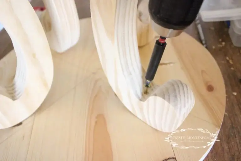 Your last order of business before the final sanding and painting is to attach the tabletop. I just centered the legs on the table, then drove 2″ screws into the tabletop through the legs.