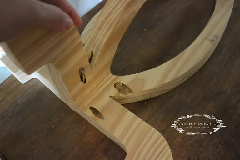 Next I put it all together. This was the trickiest part, but it really wasn’t that tricky. I wanted to make sure that my screws weren’t going to run into each other when I screwed everything in. With the first two pieces, I drilled two pocket holes on the very top and very bottom of the joint, then screwed them together. To make sure your table is level, don’t try to line up the center. If yours turns out like mine the joining edges will all be different sizes. (Not sure how because I traced the same pattern onto each one). You’ll want to stand it on end and make sure the bottoms of your legs, the part that is touching the floor is level. Then screw it in that way.