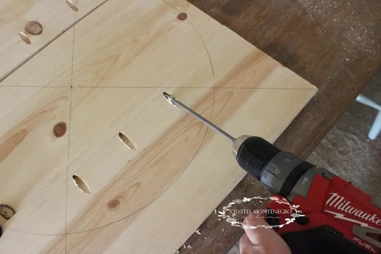 The next order of business was to drill my pocket holes. I didn’t want to drill the holes first because I wanted to make sure they were going to be safely within the circle so I wouldn’t cut them off. Once the holes were drilled I attached the boards with 1 1/4″ screw.