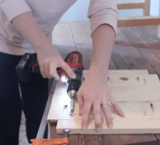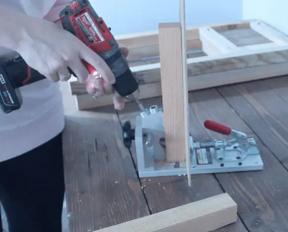 Next, grab your 4 2×2’s that are 11 1/4″ long. Drill pocket holes on each end.