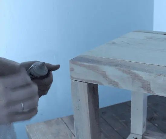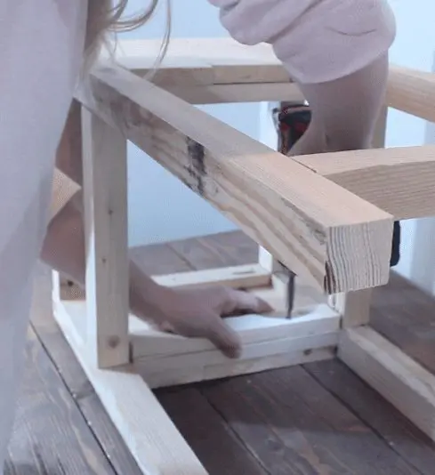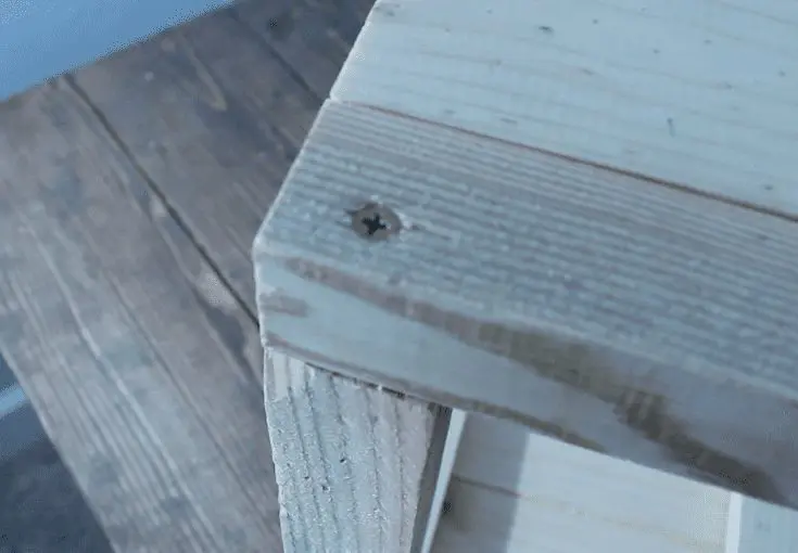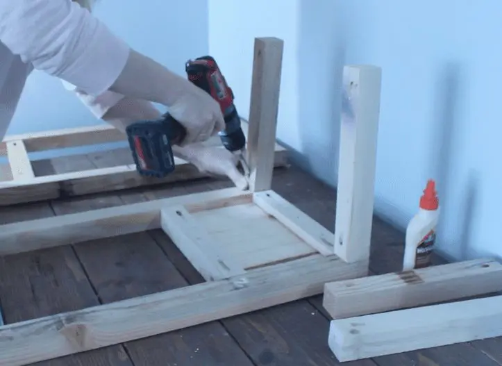 Use the marks you made, add glue, and screw in your 2×2’s. If you don’t have a kreg jig, drill two pilot holes on the legs where you want your screws to go, then screw in your supports from the outside in with 2″ screws. You’ll want to bury the nail head deep enough that you can cover it with some wood filler. I had to do this later on and I’ll show you what I mean.