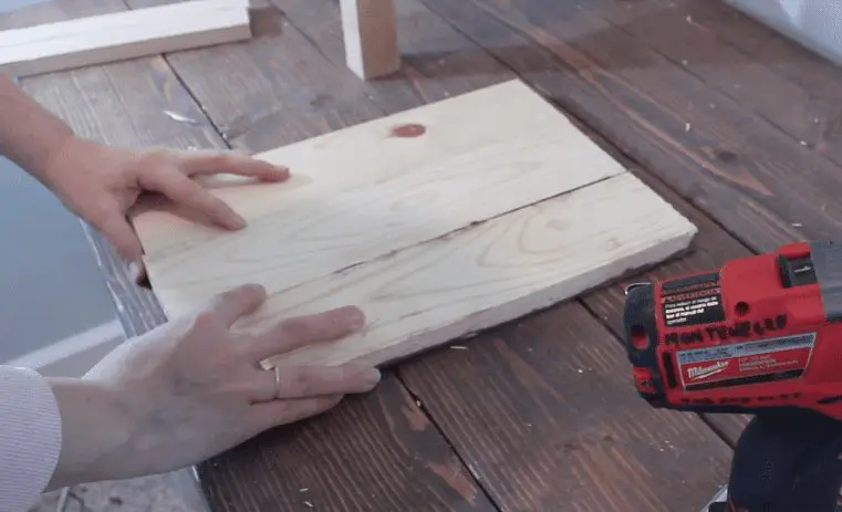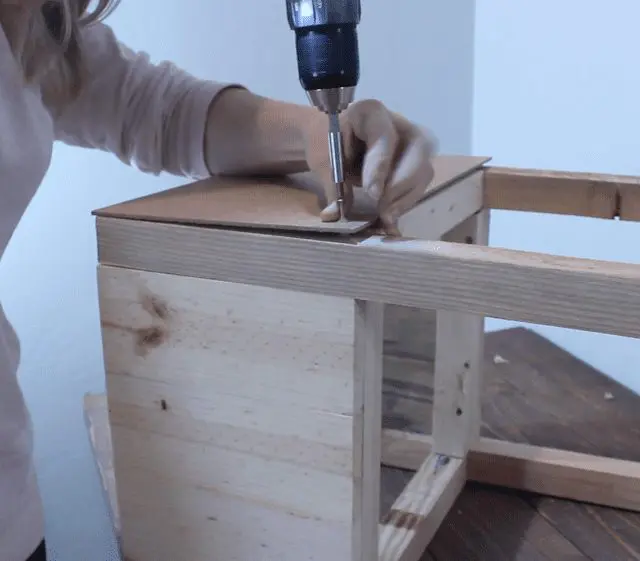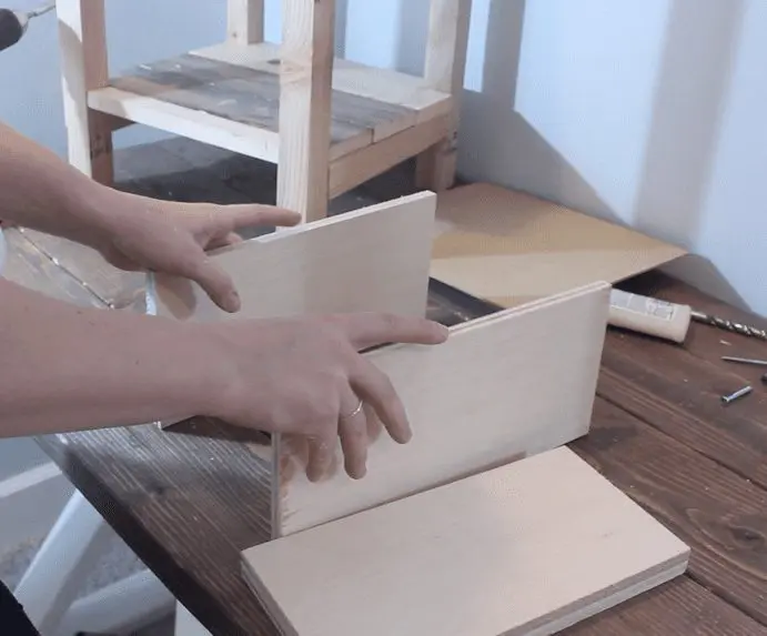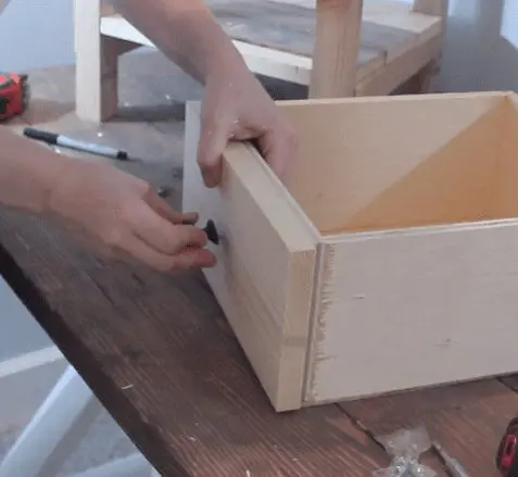 Next, build your drawers. You want the drawer to be longer rather than wider, so you’ll position your 12″ boards parallel to each other and use your 11″ boards for the front and back of the drawer.