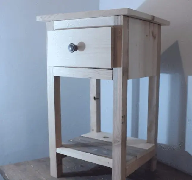 Not pictured: I also attached the bottom of the drawer (tempered hardboard) with my finish nailer. I made sure to check my drawer dimensions to see if they fit correctly, and the drawer had a hard time going in unless I fidgeted with it for a while. So, I added a guide for my drawer by screwing in place a 10 1/2″ 1×2 into the nightstand on either side of the drawer. This helped it go in much smoother. Also, if you really want smooth movement, coat the bottom of the drawer with some household wax to eliminate any friction. The tempered hardboard does have an almost waxy side to it which I made sure to put that side facing down, but more wax will help.