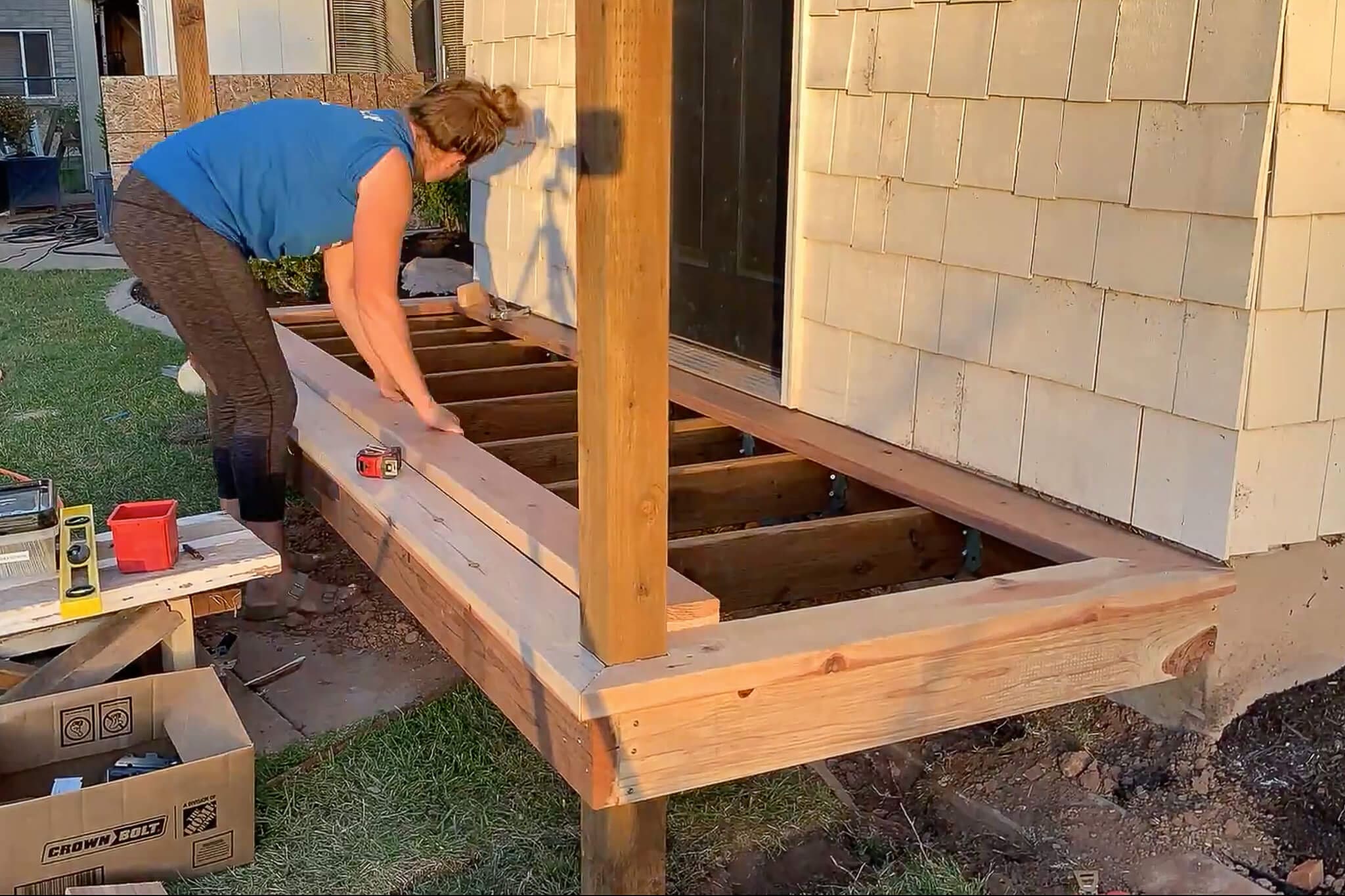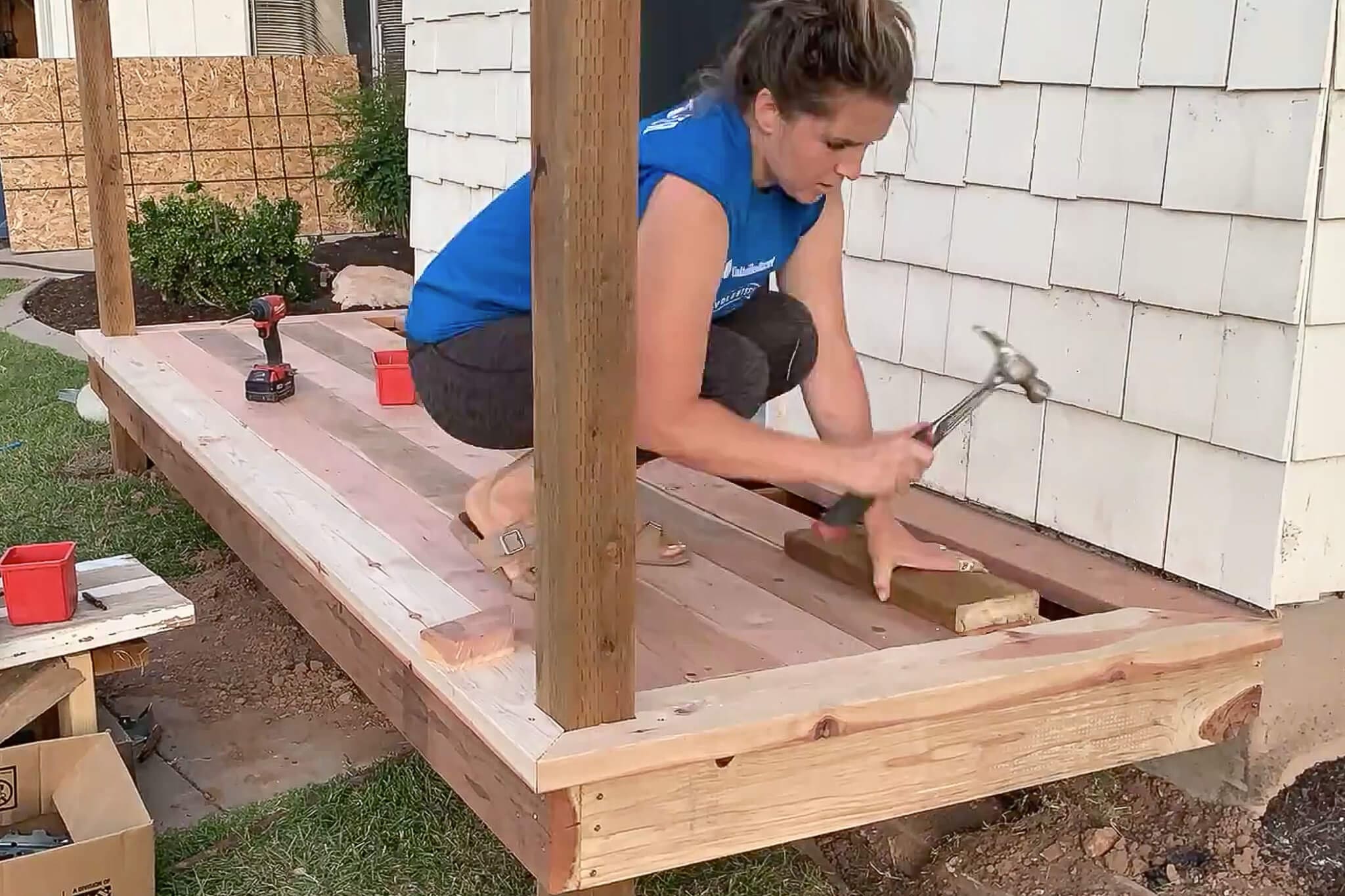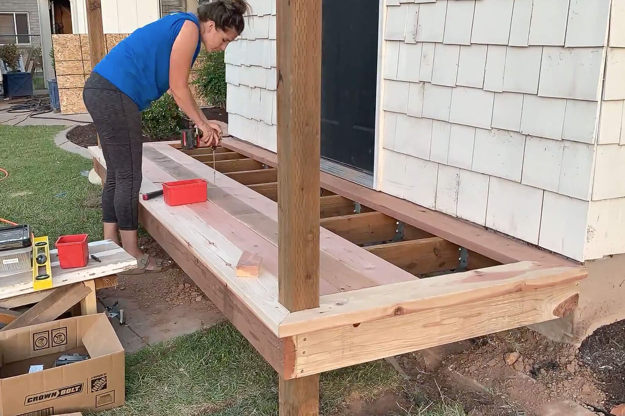 This was the moment I stepped back and thought – okay, this DIY small front porch is actually starting to look legit. Let’s lay those deck boards.