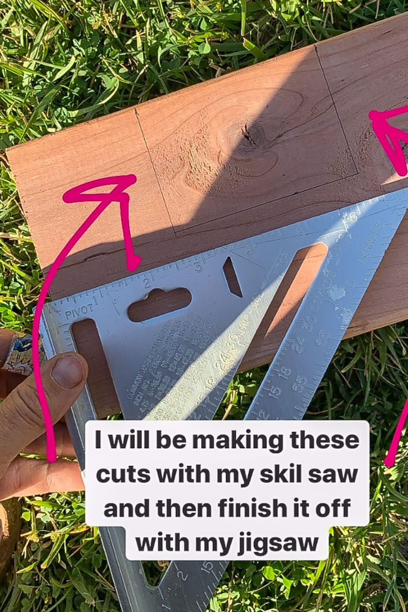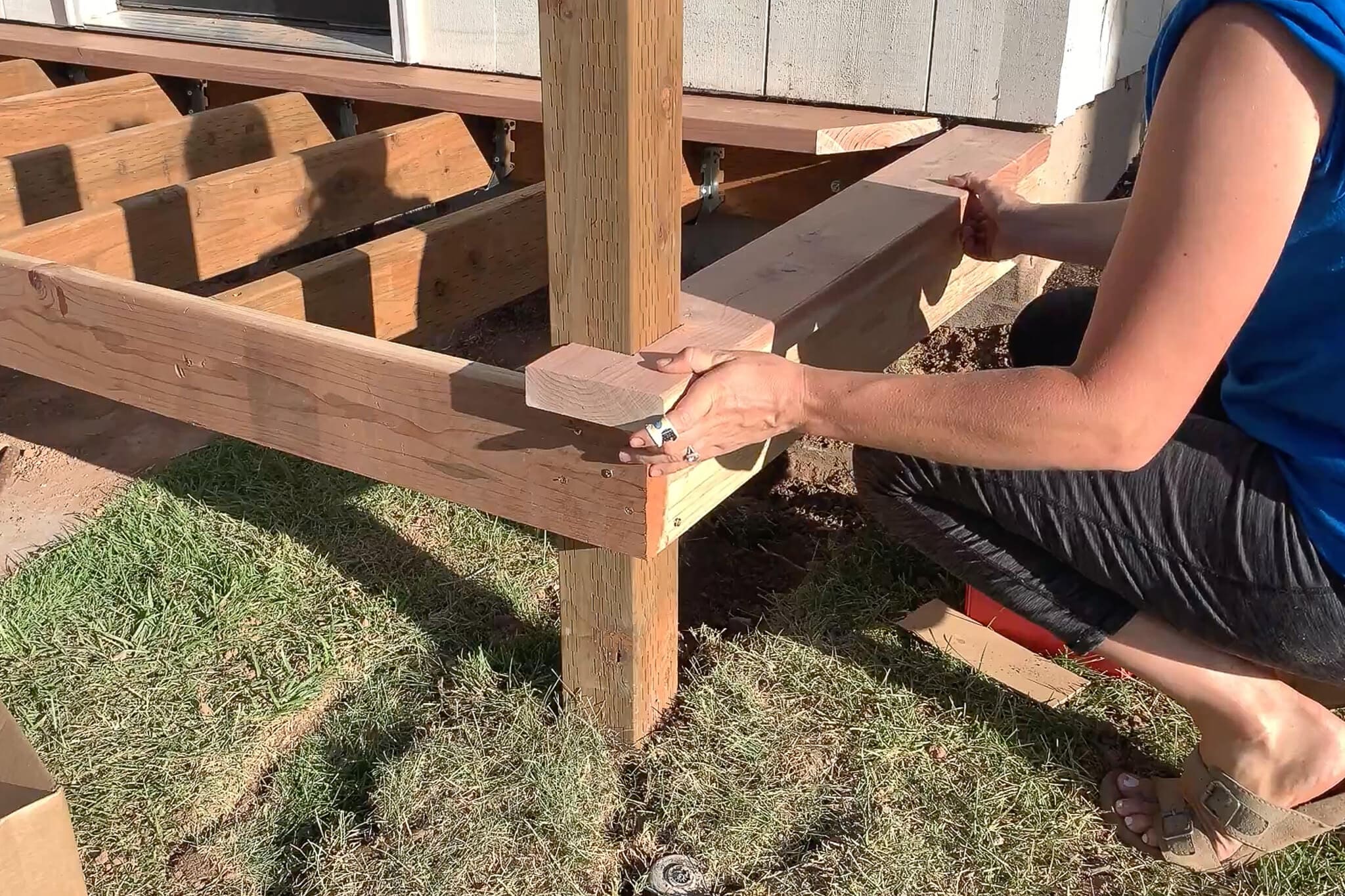 I held the board up to the post and marked the outline with a pencil. Then I used my jigsaw to cut a square notch. It wasn’t perfect, but it fit snug and looked great once in place on our DIY small front porch.