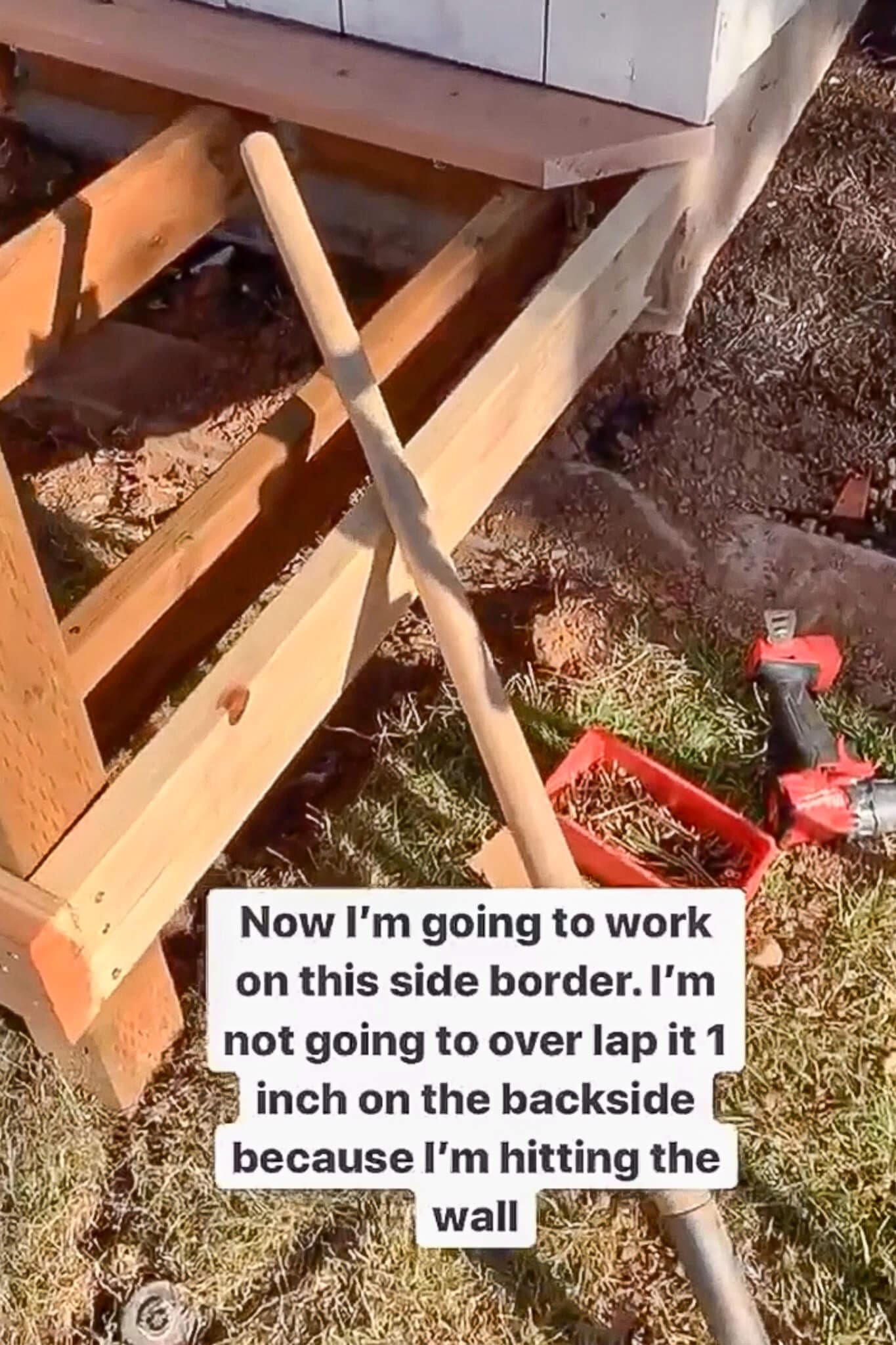 Next up: trimming the side boards. I measured from the house to the outer edge of the rim joist and added 1 inch for overhang. Since one of the side boards ran into a porch post, I had to cut a notch so the trim would sit flush.