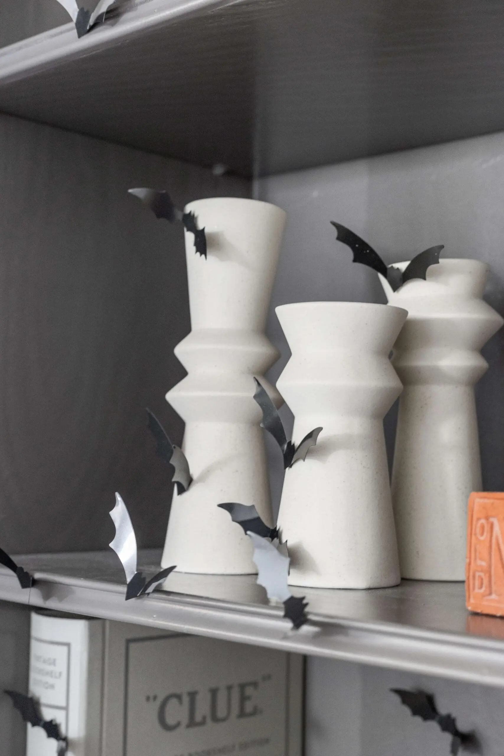 The real cherry on top of my elegant Halloween decorations has to be the stick-on bats! I used a pack that came with different sizes, and they’re so easy to use—just peel, stick, and boom, instant spooky magic. We created this cool swarm starting on the fireplace and stretching all the way up to the arched shelves. It’s such a showstopper!