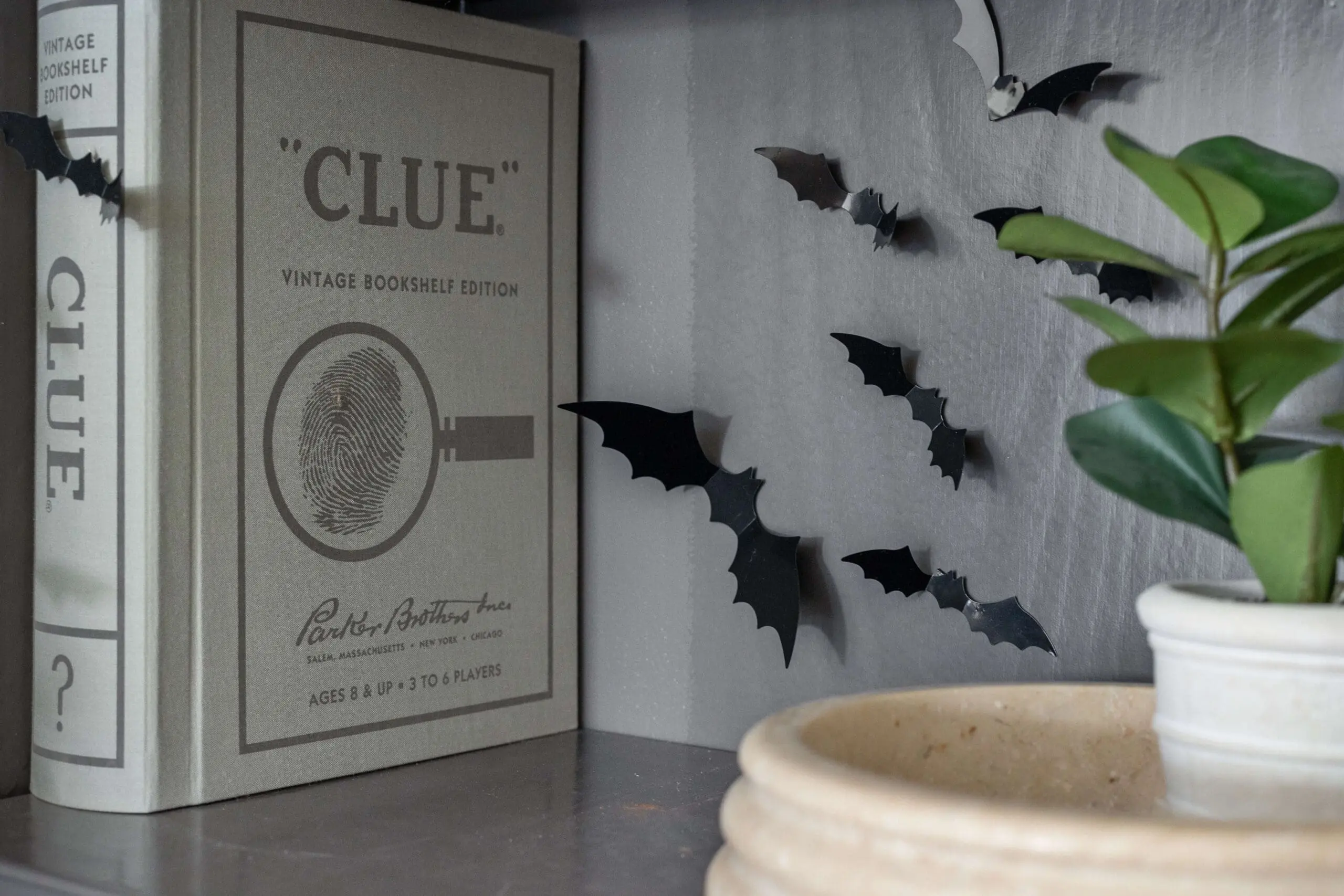 My regular, everyday decor, like these board games that look like books, instantly gets that Halloween magic just by popping up a few bats nearby. It’s such a simple yet effective way to give everyday stuff a spooky transformation!