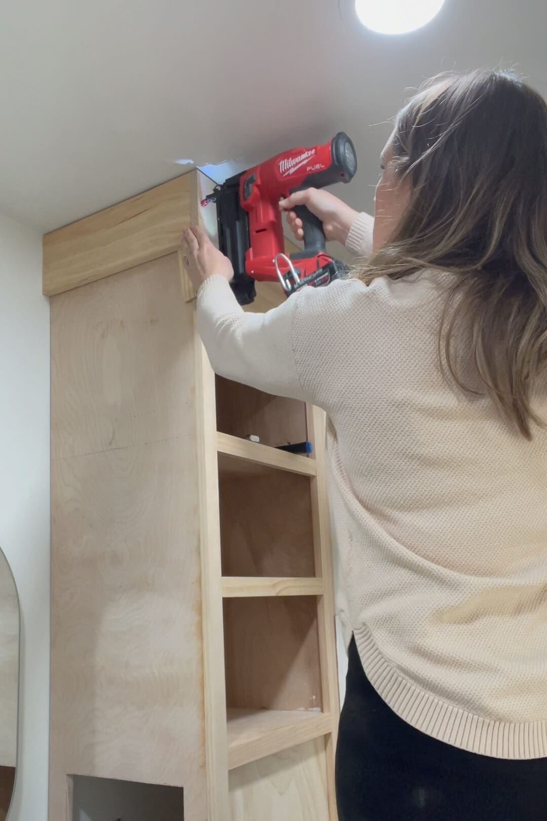 With the access door cut and the cabinet secured, it was time for trim! I added a face frame and crown molding using my brad nailer.