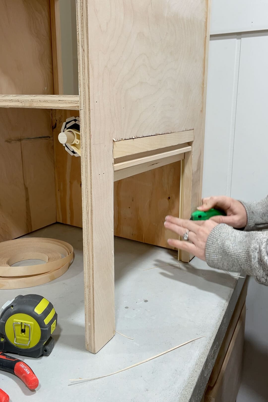 Next, I attached a small board to the back of the counter cabinet with screws – this acts as an anchor point to secure it to the wall.