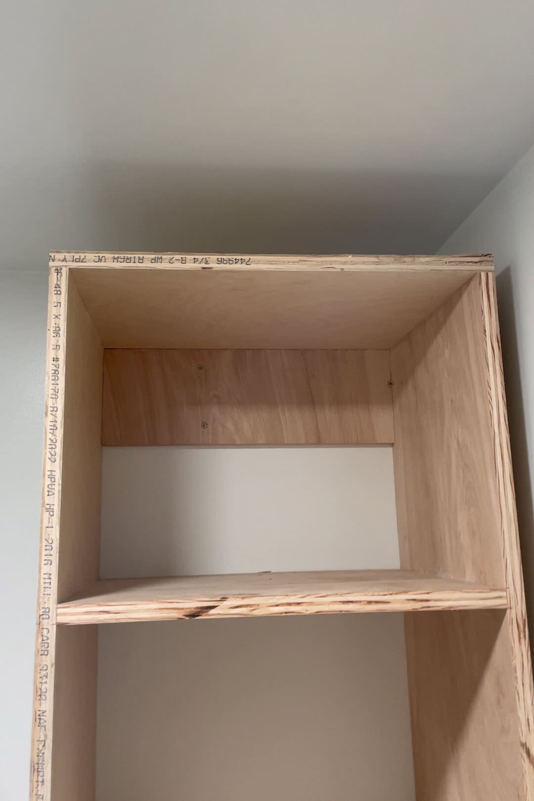 This step made a huge difference – the face frame hid any gaps and covered unfinished plywood edges, while the crown molding filled the space at the top. Instant polished, built-in look!