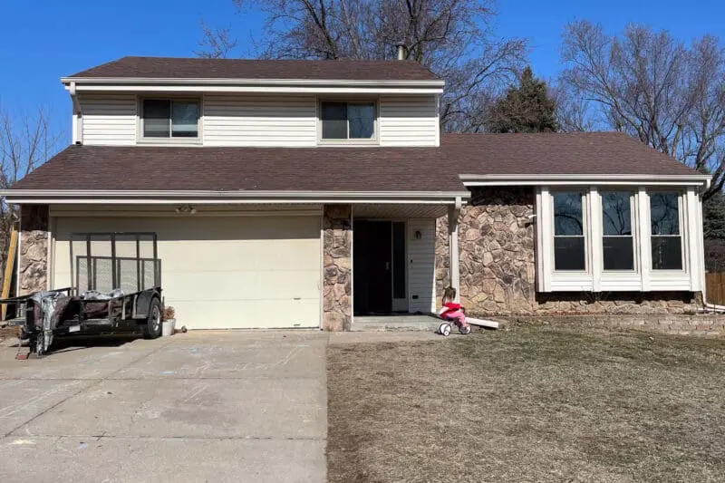 This summer I’ve been busting out the front yard projects! I’ve planted some new landscaping, laid sod, gave that old, ugly 1970s rock siding a makeover, and more. You can see almost a third of the front of the house is garage door, so I decided it needed a facelift too and I wanted to transform it into a faux wood garage door.
