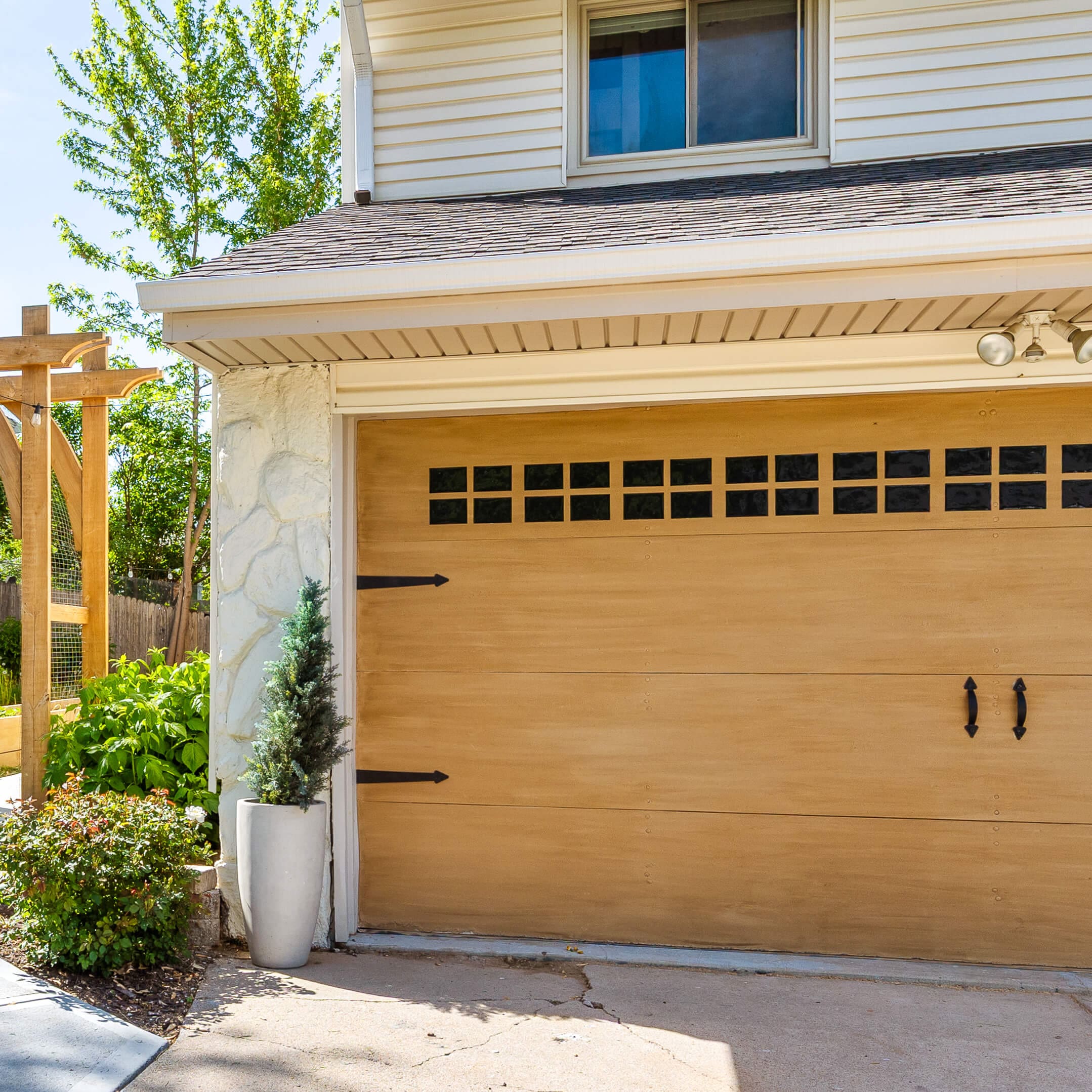 And that’s it! I seriously can’t get over how much I love the after photos. My faux wood garage door turned out so good! The color matches my garden arbor perfectly, and the accents I glued on? They’re the cherry on top.