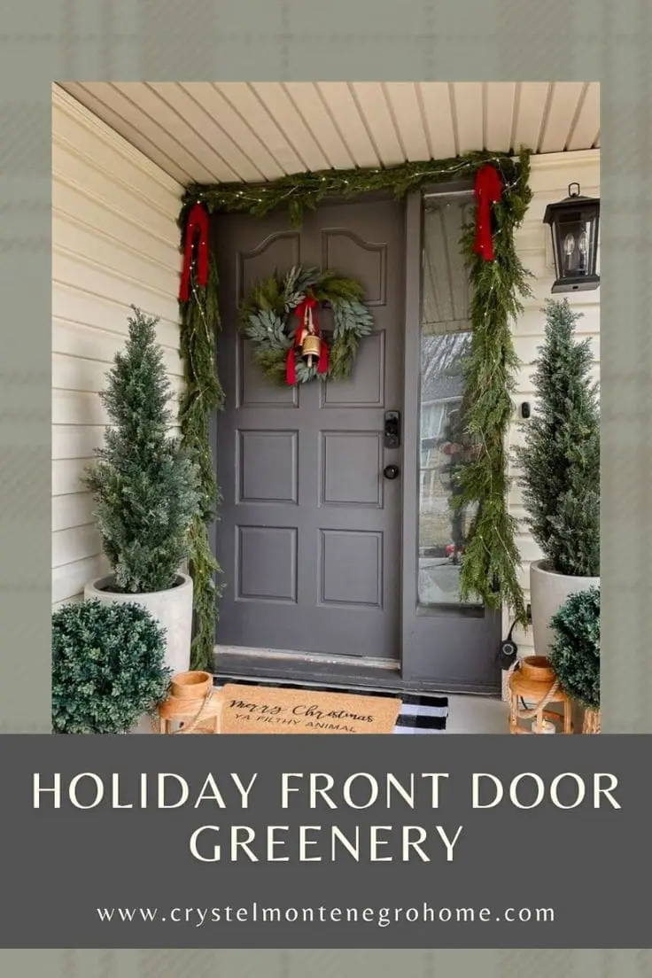 Cedar topiaries, boxwood plants, and Norfolk pine garlands and wreaths make great choices for a festive porch