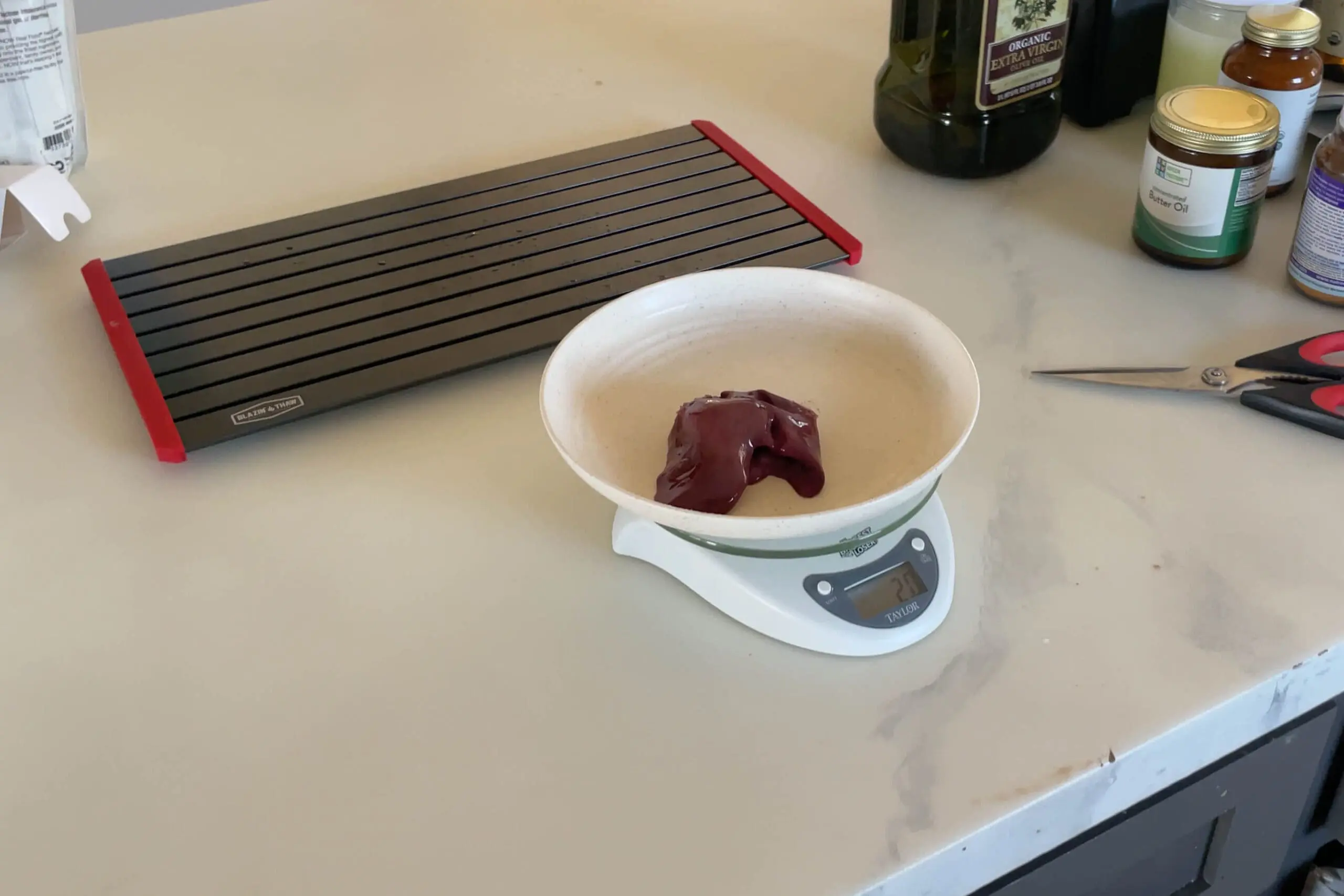 Once I pulled some chicken livers from the freezer, I thawed them super fast on my defrosting tray and then measured out 2 ounces on my food scale.