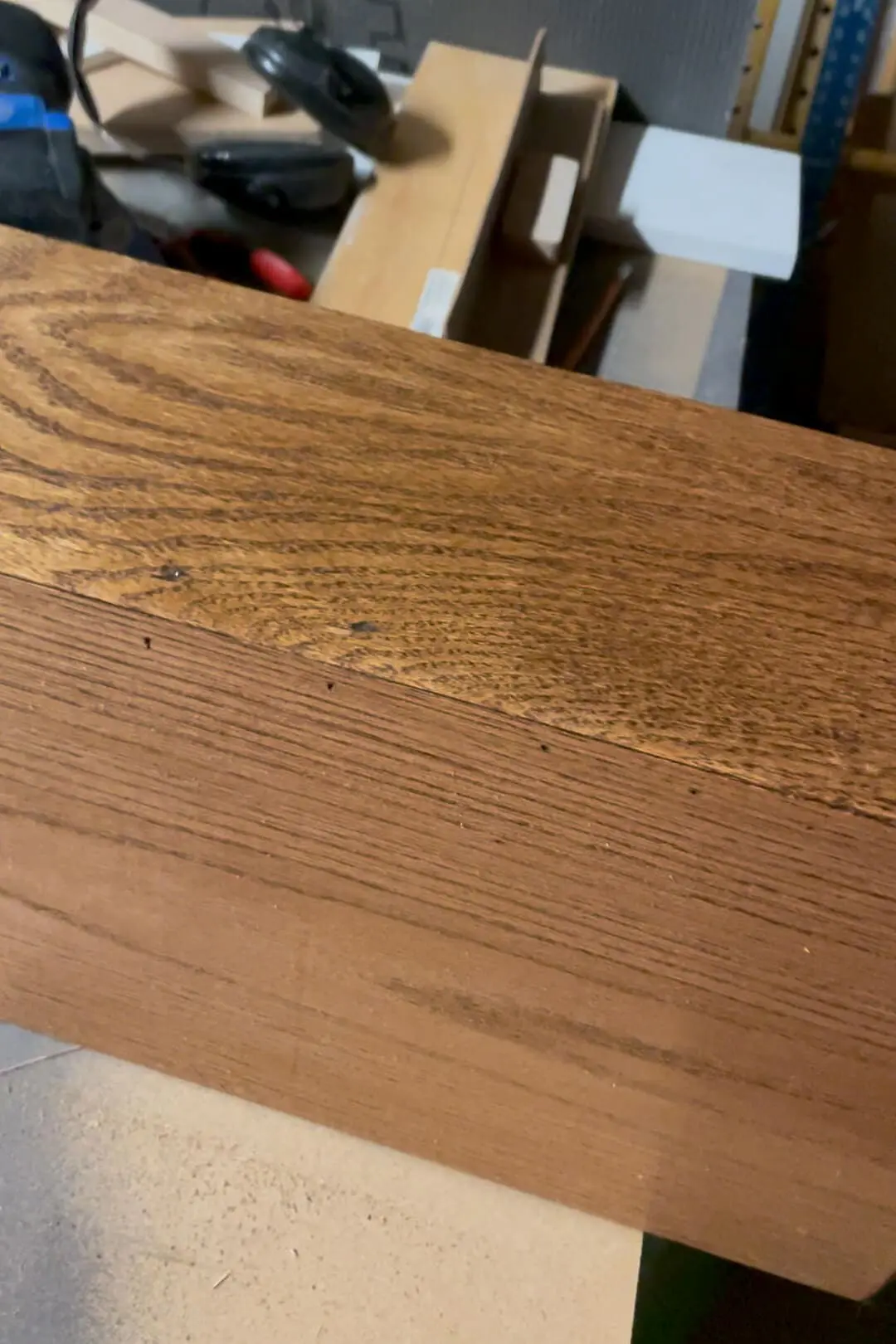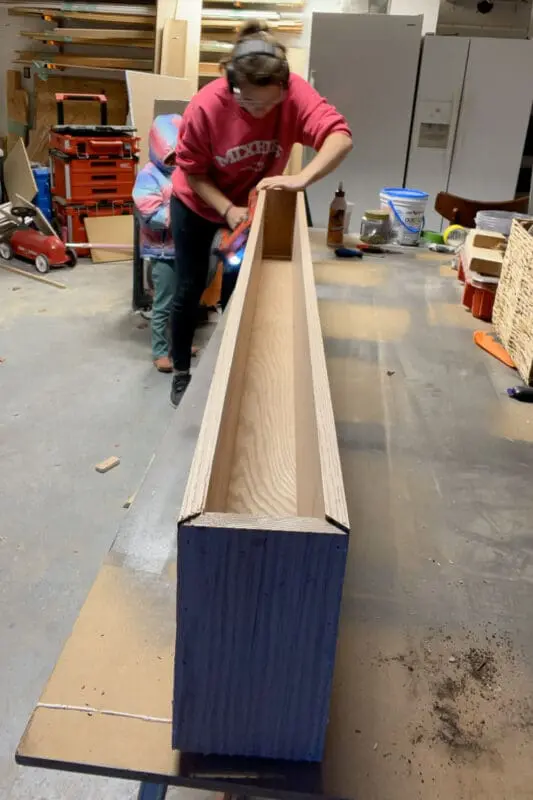 I decided to DIY a new one to resemble a solid beam without the heavy weight and cost. I cut the wood with beveled edges at a 45° angle using my table saw, assembled the pieces into a box shape with wood glue and a brad nailer.